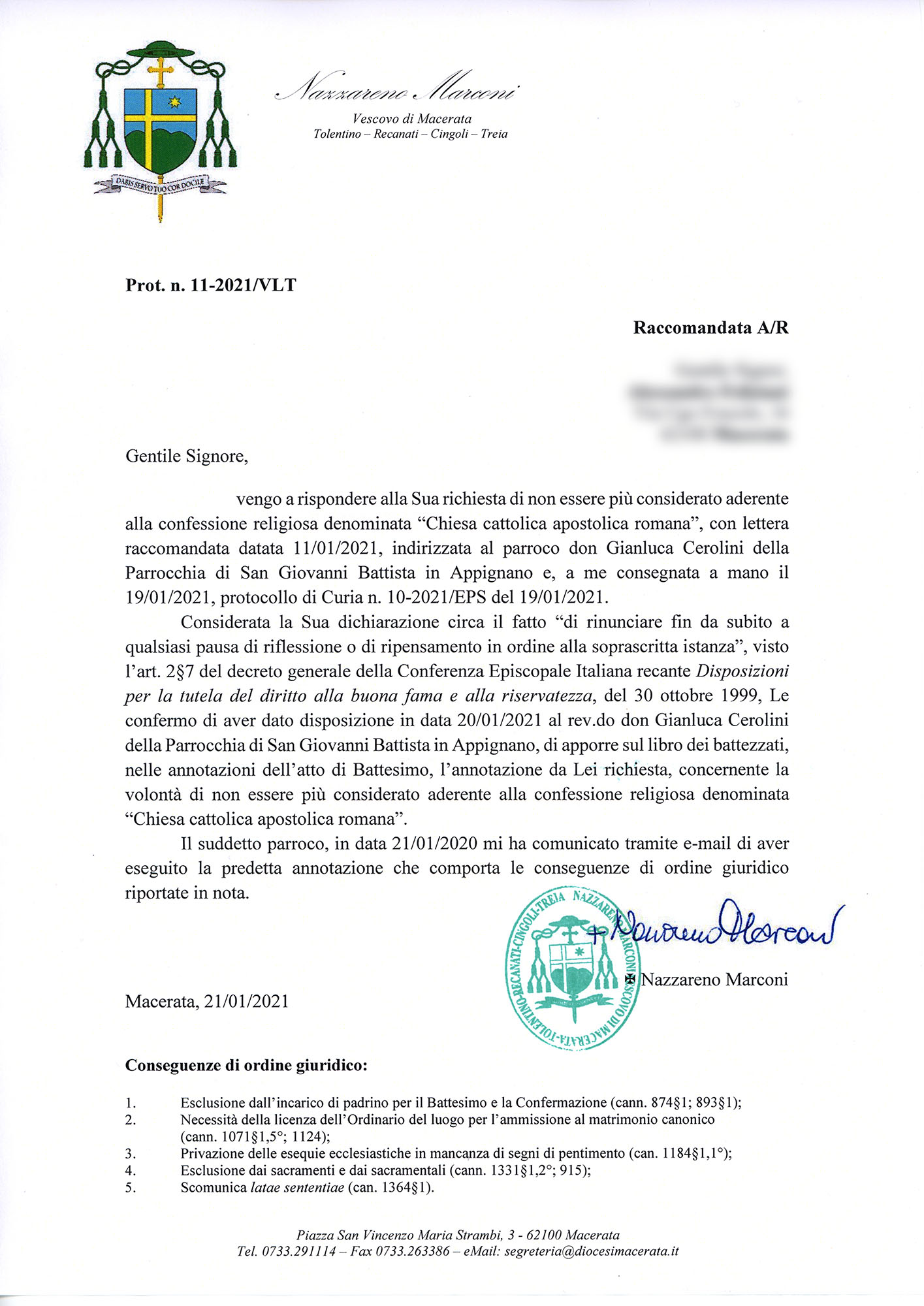 Una persona ha chiesto la rettifica dei dati relativi al proprio battesimo avvenuto a S. Giovanni Battista - APPIGNANO (MC) il 21/01/2021, dichiarando di non voler più far parte della Chiesa Cattolica.