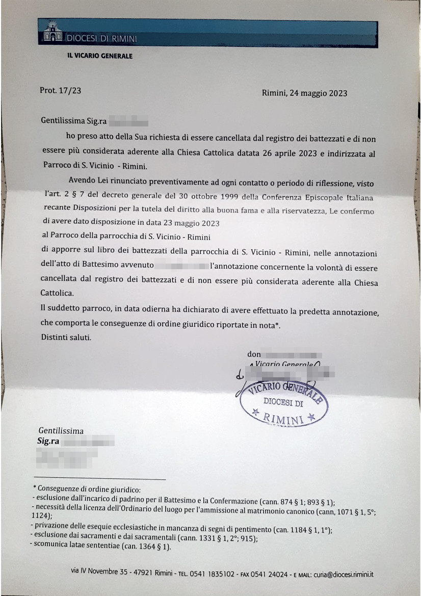 Una persona ha chiesto la rettifica dei dati relativi al proprio battesimo avvenuto a San Vicinio - RIMINI (RN) il 24/05/2023, dichiarando di non voler più far parte della Chiesa Cattolica.