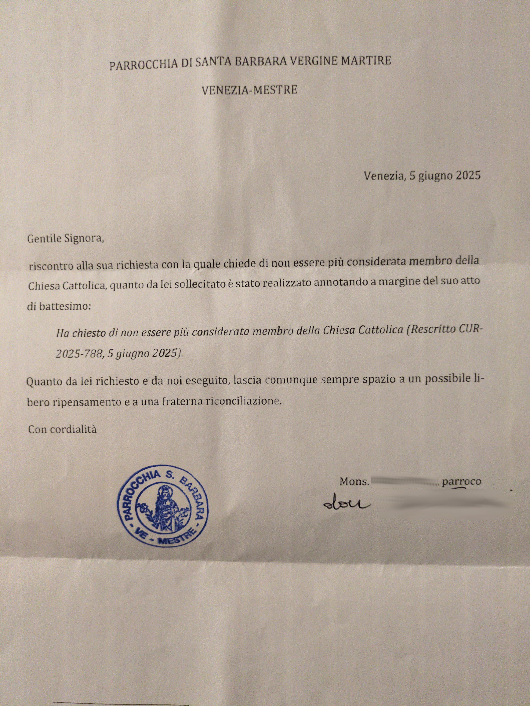 Una persona ha chiesto la rettifica dei dati relativi al proprio battesimo avvenuto a S. Barbara Vergine Martire - VENEZIA (VE) il 25/06/2025, dichiarando di non voler più far parte della Chiesa Cattolica.