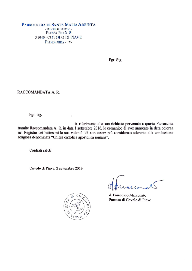 Una persona ha chiesto la rettifica dei dati relativi al proprio battesimo avvenuto a S. Maria Assunta - PEDEROBBA (TV) il 02/09/2016, dichiarando di non voler più far parte della Chiesa Cattolica.