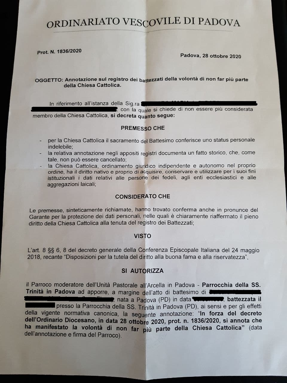 Una persona ha chiesto la rettifica dei dati relativi al proprio battesimo avvenuto a Santissima Trinità - PADOVA (PD) il 28/10/2020, dichiarando di non voler più far parte della Chiesa Cattolica.