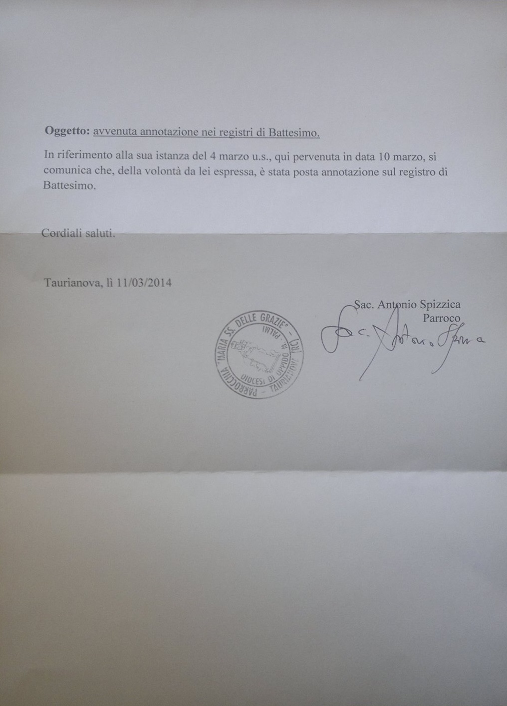 Una persona ha chiesto la rettifica dei dati relativi al proprio battesimo avvenuto a Maria Ss. delle Grazie - TAURIANOVA (RC) il 11/03/2014, dichiarando di non voler più far parte della Chiesa Cattolica.