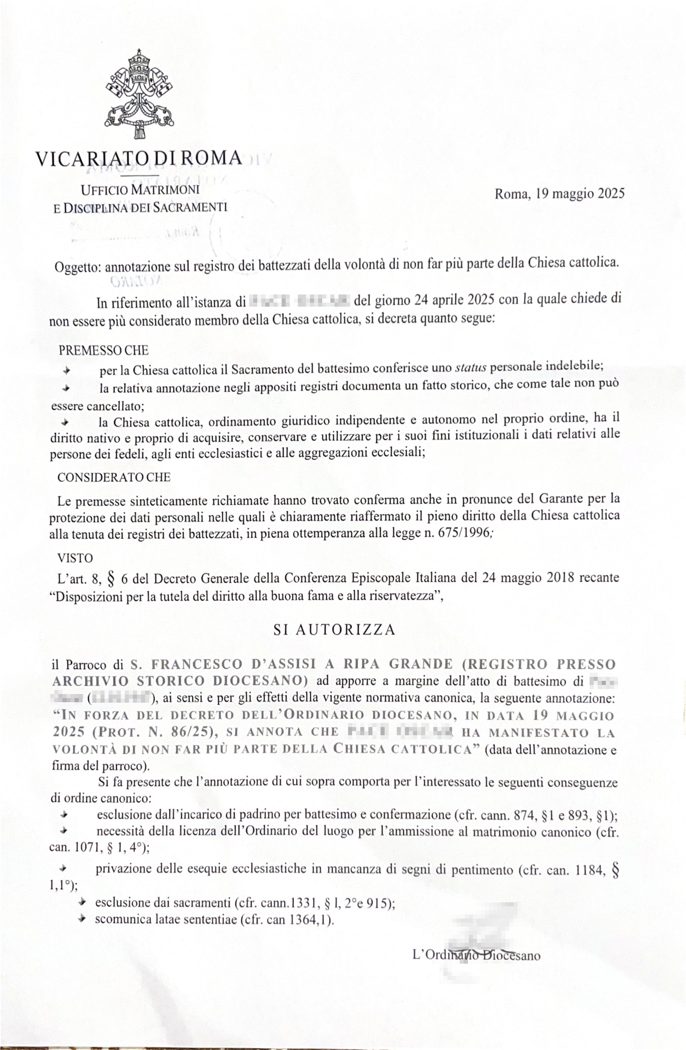 Una persona ha chiesto la rettifica dei dati relativi al proprio battesimo avvenuto a S. Francesco d'Assisi a Ripa Grande - ROMA (RM) il 19/05/2025, dichiarando di non voler più far parte della Chiesa Cattolica.