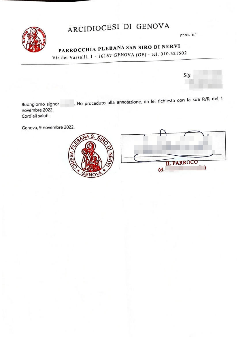 Una persona ha chiesto la rettifica dei dati relativi al proprio battesimo avvenuto a S. Siro - GENOVA (GE) il 17/11/2022, dichiarando di non voler più far parte della Chiesa Cattolica.