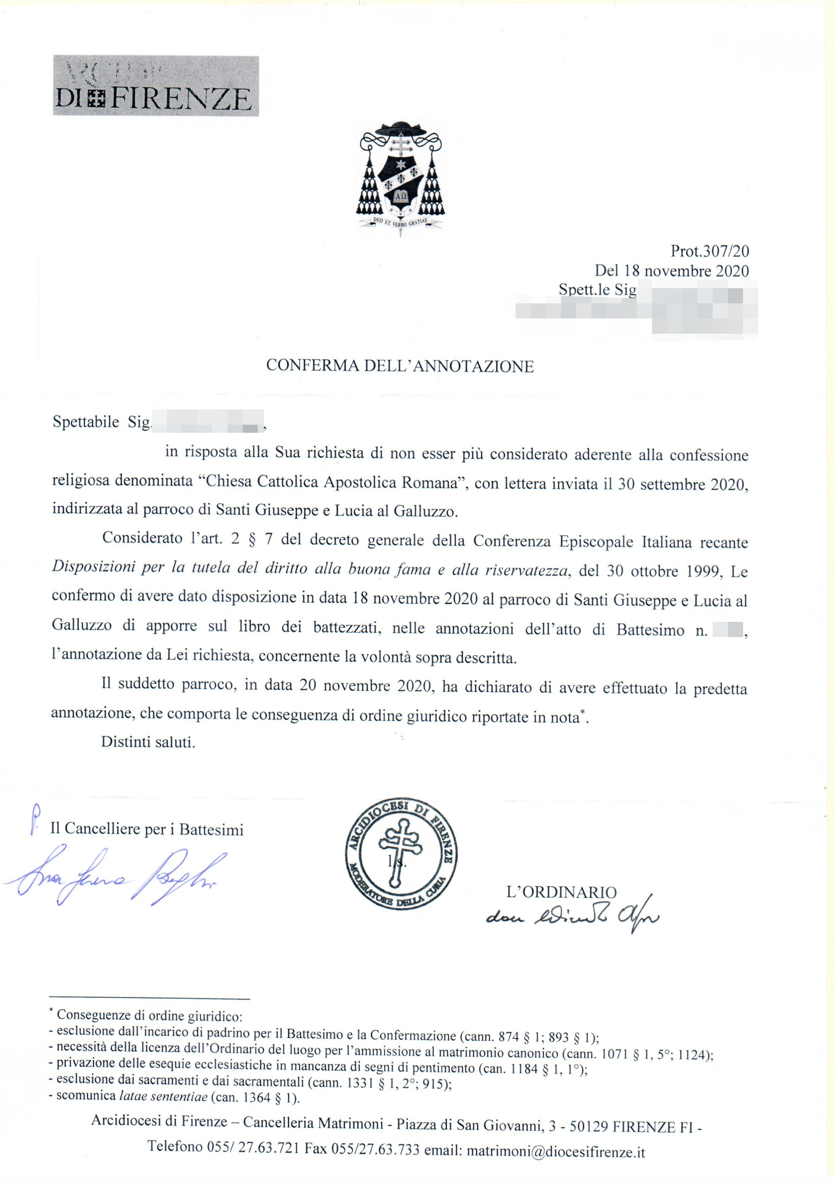 Una persona ha chiesto la rettifica dei dati relativi al proprio battesimo avvenuto a Santi Giuseppe e Lucia al Galluzzo - FIRENZE (FI) il 20/11/2020, dichiarando di non voler più far parte della Chiesa Cattolica.