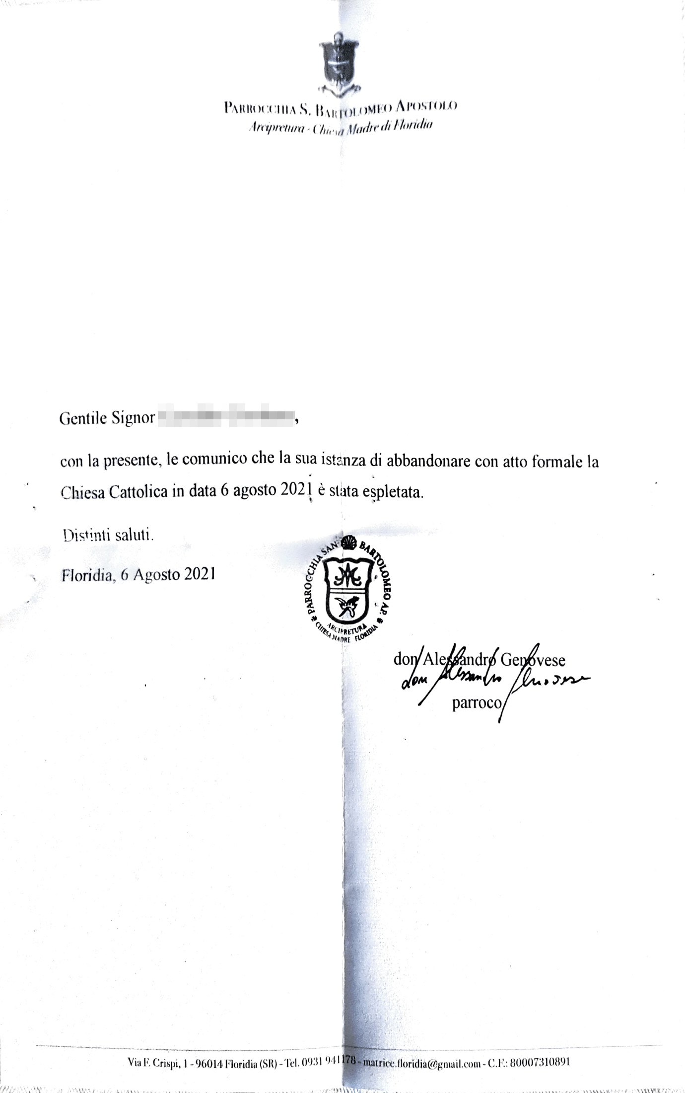 Una persona ha chiesto la rettifica dei dati relativi al proprio battesimo avvenuto a S. Bartolomeo Apostolo - FLORIDIA (SR) il 06/08/2021, dichiarando di non voler più far parte della Chiesa Cattolica.