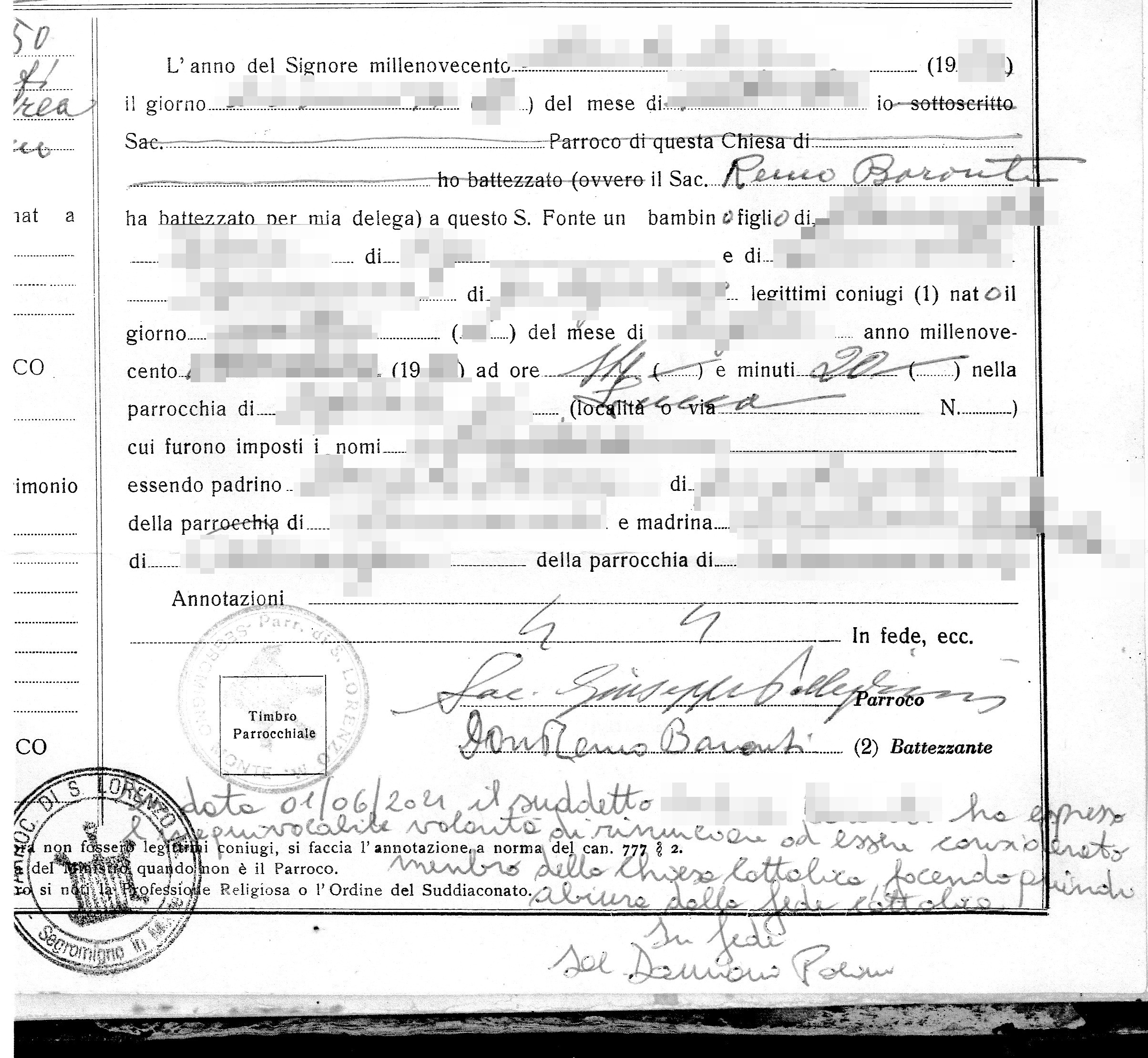 Una persona ha chiesto la rettifica dei dati relativi al proprio battesimo avvenuto a San Lorenzo - CAPANNORI (LU) il 22/07/2021, dichiarando di non voler più far parte della Chiesa Cattolica.