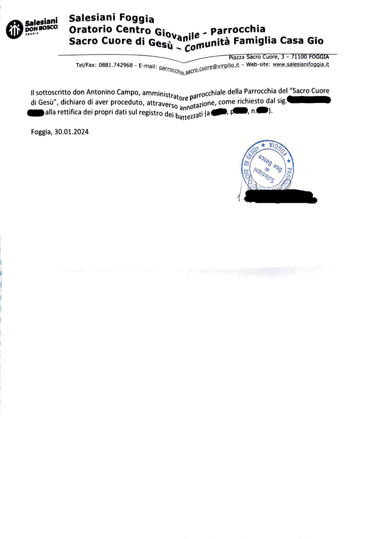 Una persona ha chiesto la rettifica dei dati relativi al proprio battesimo avvenuto a S. Cuore di Gesù - FOGGIA (FG) il 07/02/2024, dichiarando di non voler più far parte della Chiesa Cattolica.