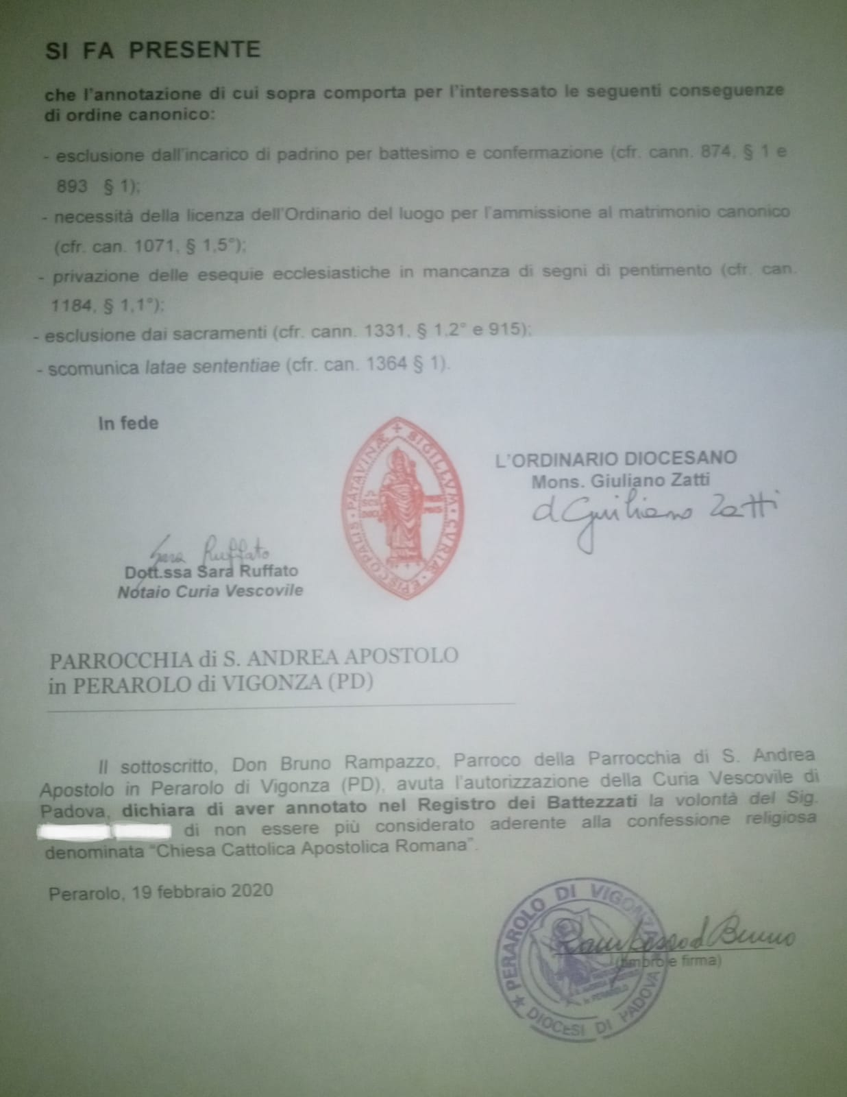 Una persona ha chiesto la rettifica dei dati relativi al proprio battesimo avvenuto a S. Andrea Apostolo - VIGONZA (PD) il 19/02/2020, dichiarando di non voler più far parte della Chiesa Cattolica.