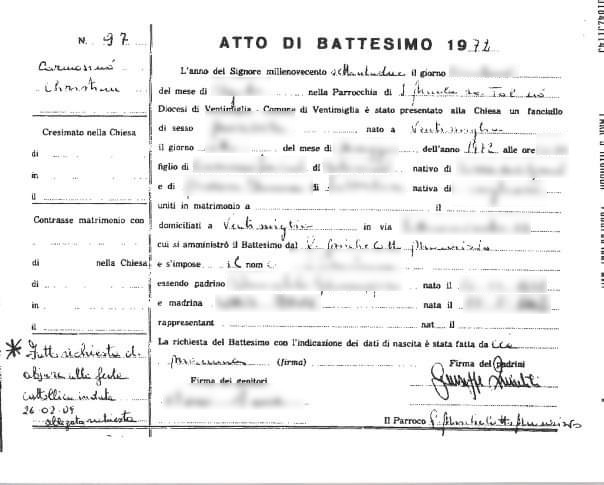 Una persona ha chiesto la rettifica dei dati relativi al proprio battesimo avvenuto a S. Nicola Da Tolentino - VENTIMIGLIA (IM) il 26/02/2009, dichiarando di non voler più far parte della Chiesa Cattolica.