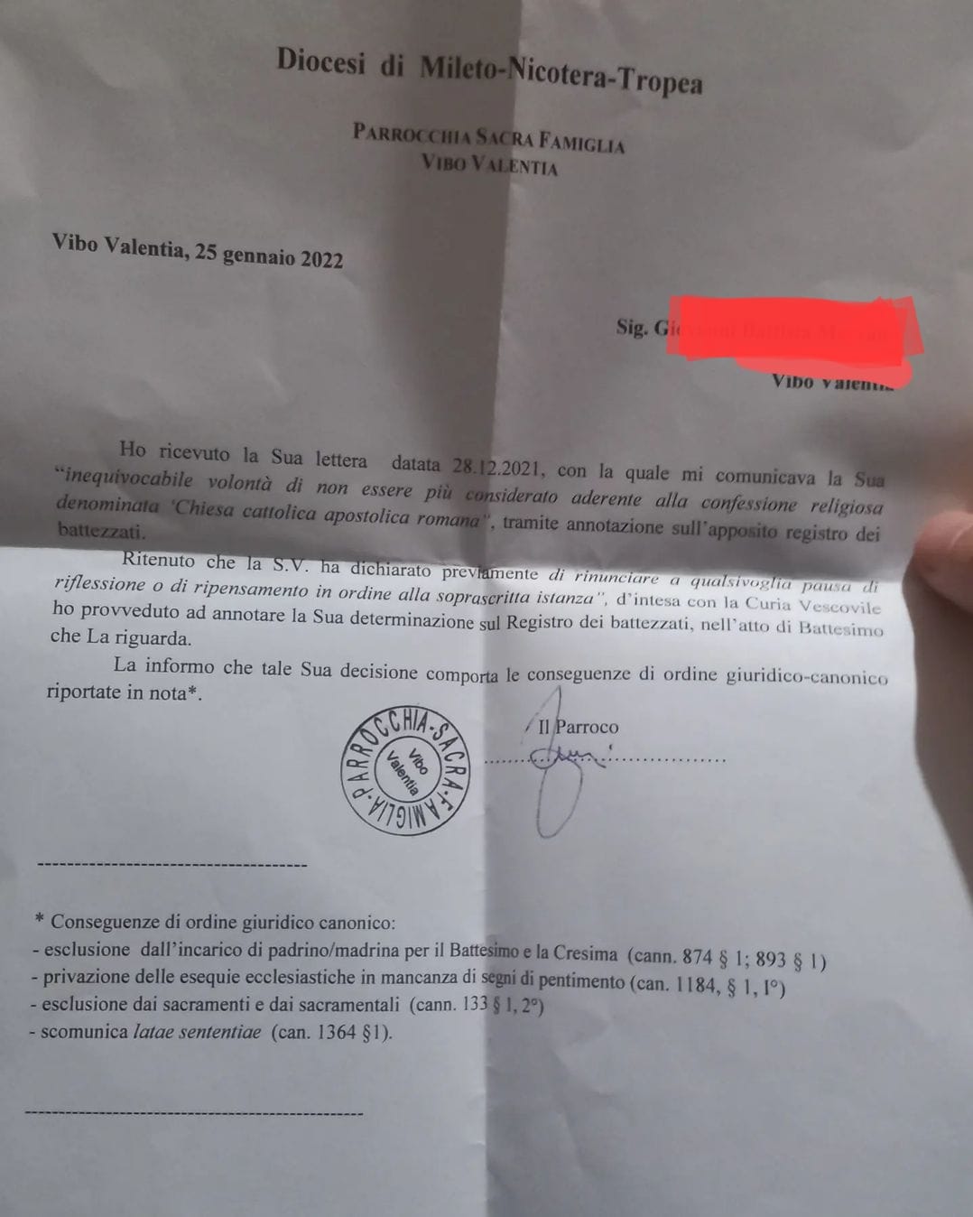 Una persona ha chiesto la rettifica dei dati relativi al proprio battesimo avvenuto a Sacra Famiglia - VIBO VALENTIA (VV) il 25/01/2022, dichiarando di non voler più far parte della Chiesa Cattolica.