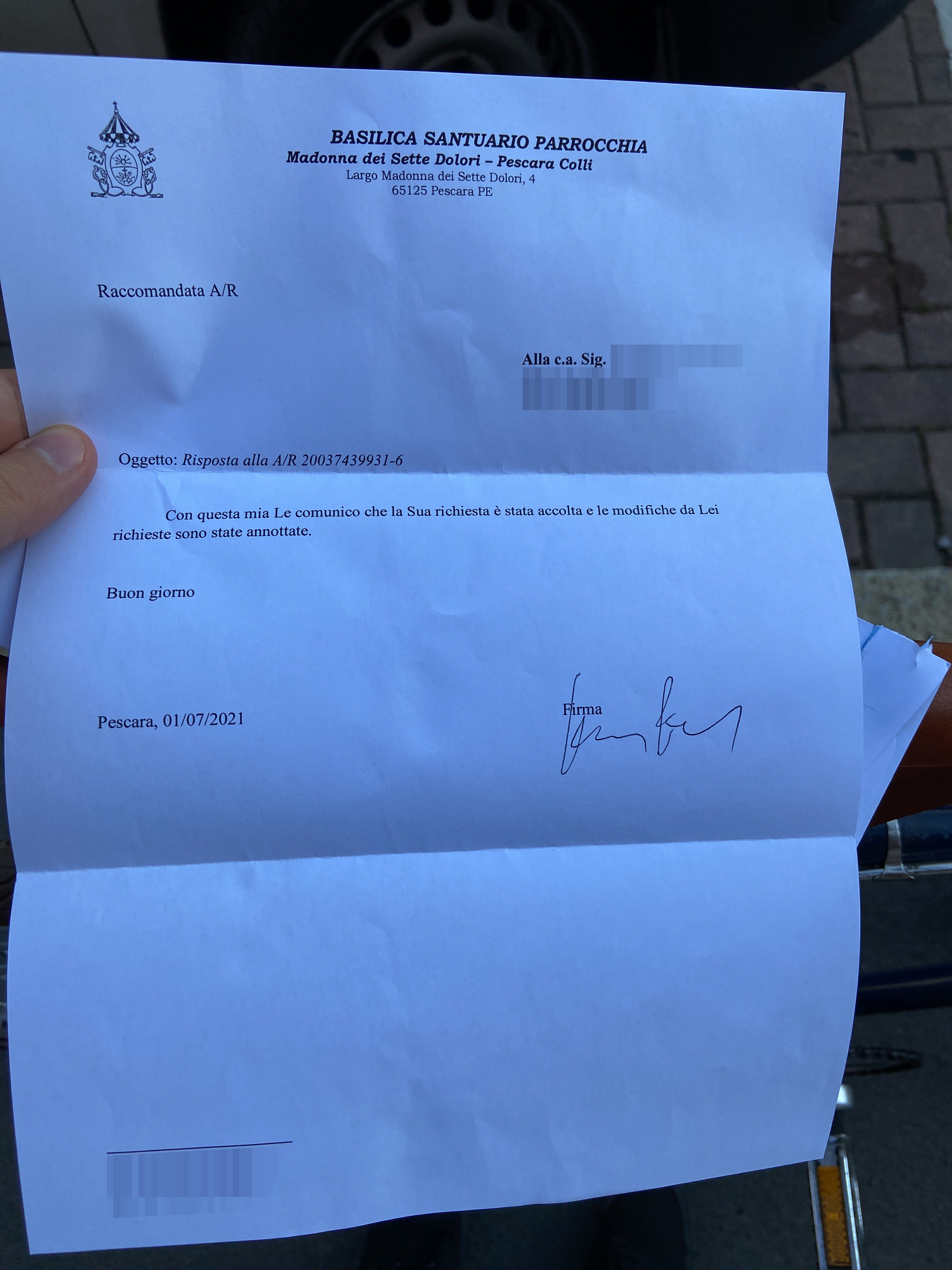 Una persona ha chiesto la rettifica dei dati relativi al proprio battesimo avvenuto a Madonna dei Sette Dolori - PESCARA (PE) il 01/07/2021, dichiarando di non voler più far parte della Chiesa Cattolica.