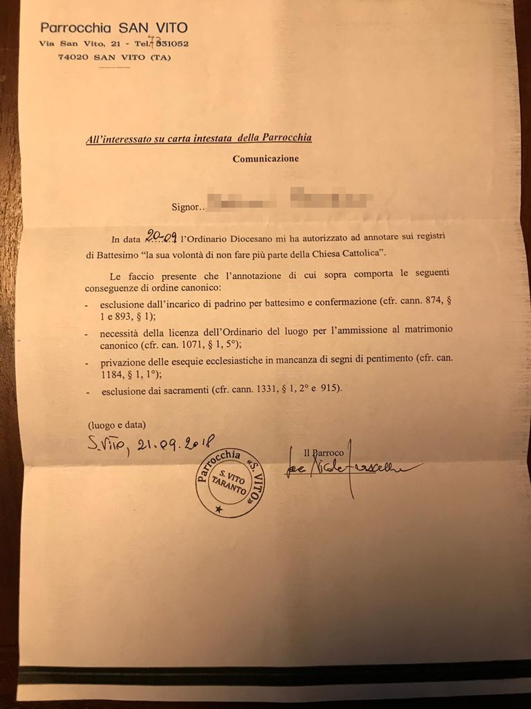 Una persona ha chiesto la rettifica dei dati relativi al proprio battesimo avvenuto a S. Vito - TARANTO (TA) il 21/09/2018, dichiarando di non voler più far parte della Chiesa Cattolica.