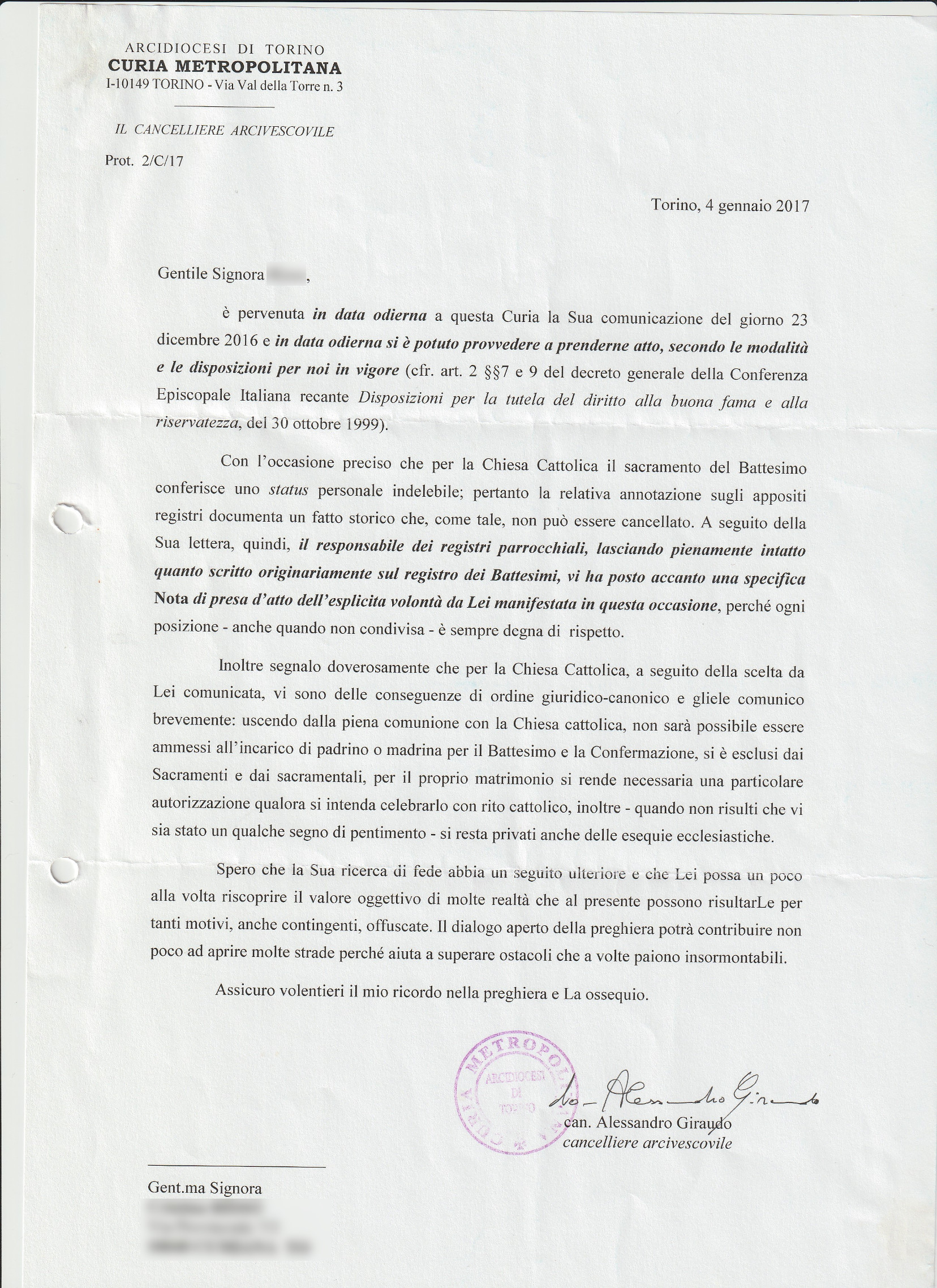 Una persona ha chiesto la rettifica dei dati relativi al proprio battesimo avvenuto a S. Giovanni Maria Vianney - TORINO (TO) il 04/01/2017, dichiarando di non voler più far parte della Chiesa Cattolica.