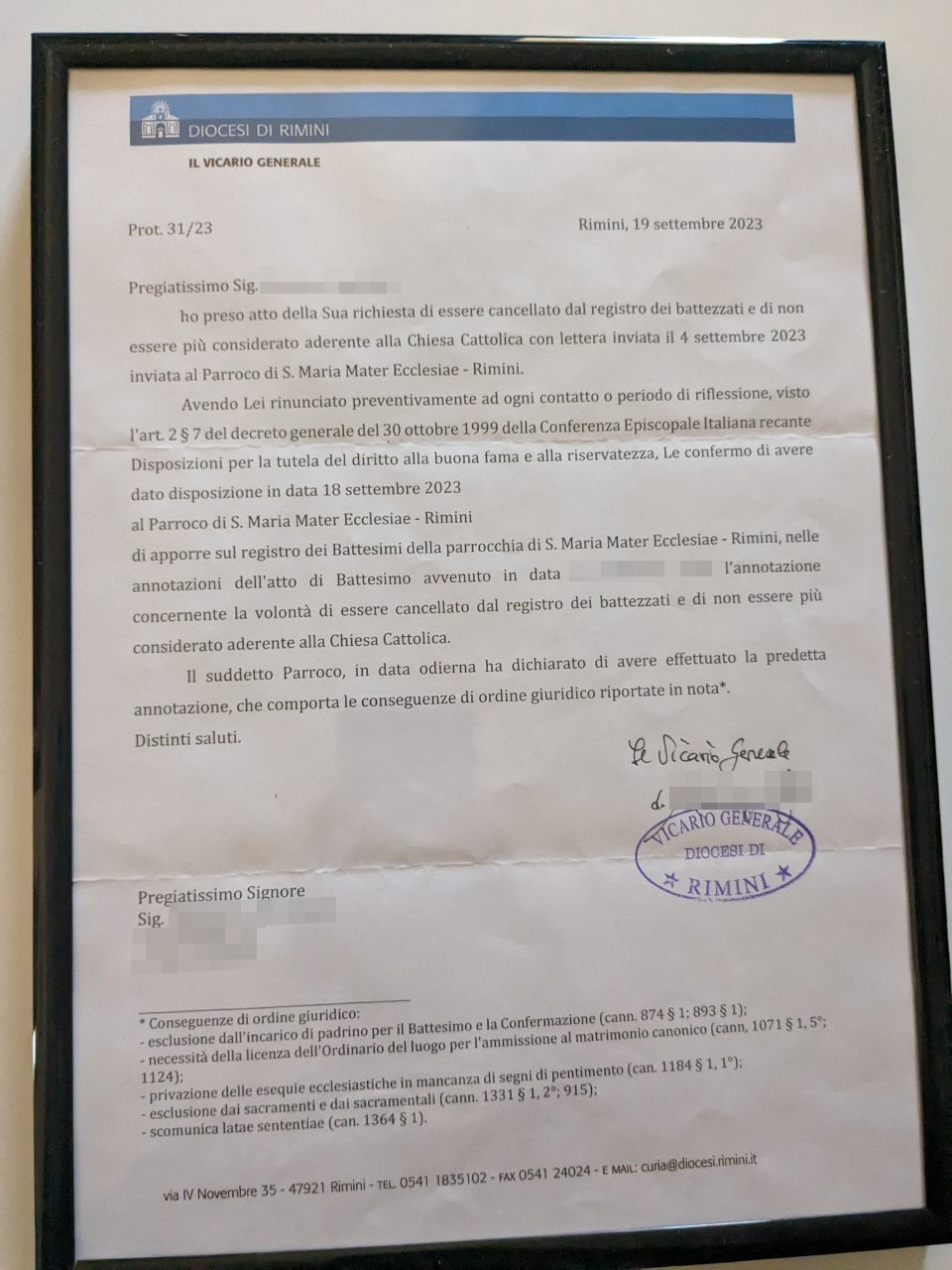 Una persona ha chiesto la rettifica dei dati relativi al proprio battesimo avvenuto a S. Maria Mater Ecclesiae - RIMINI (RN) il 18/09/2023, dichiarando di non voler più far parte della Chiesa Cattolica.
