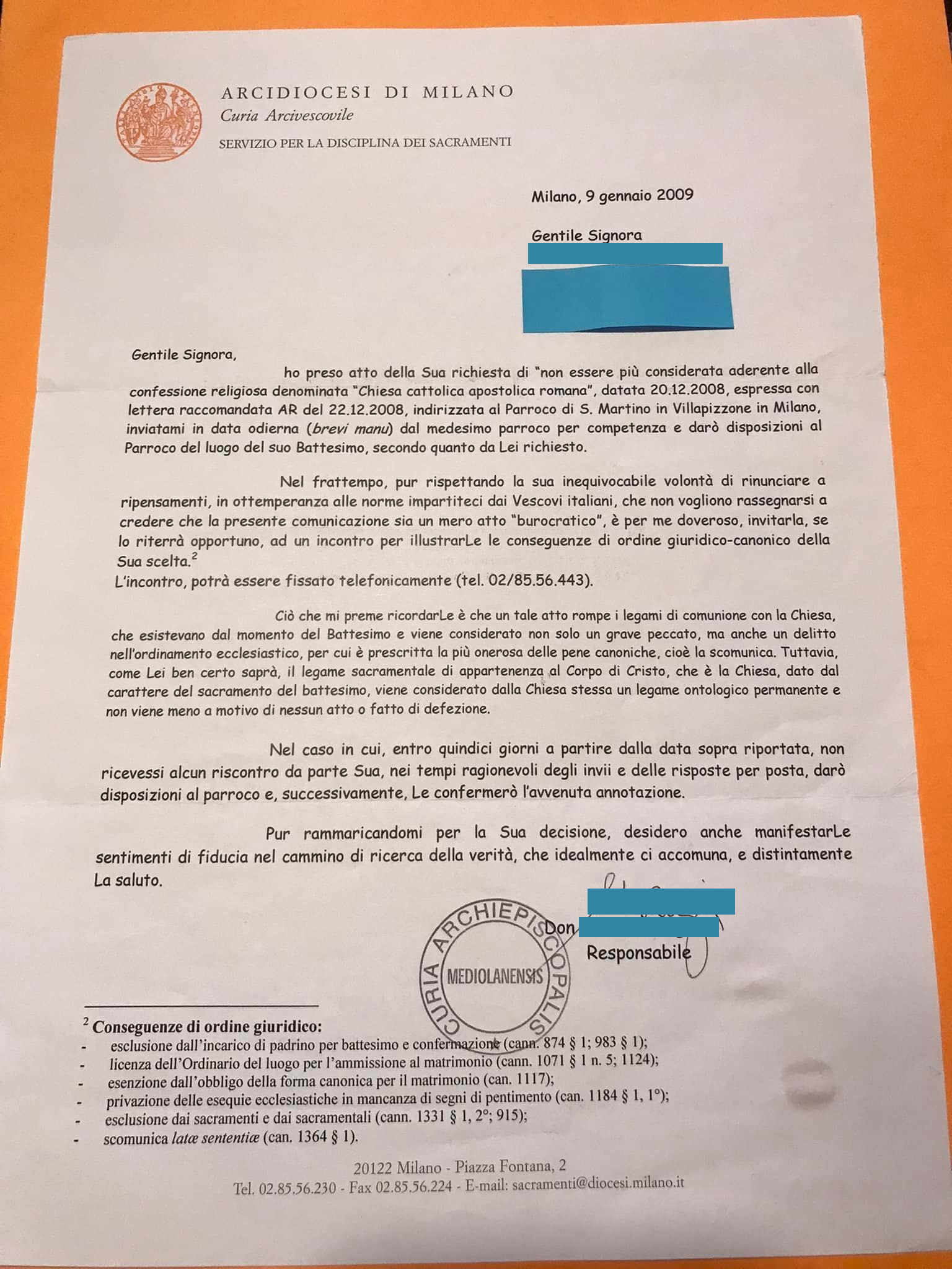 Una persona ha chiesto la rettifica dei dati relativi al proprio battesimo avvenuto a S. Martino in Villapizzone - MILANO (MI) il 09/01/2009, dichiarando di non voler più far parte della Chiesa Cattolica.