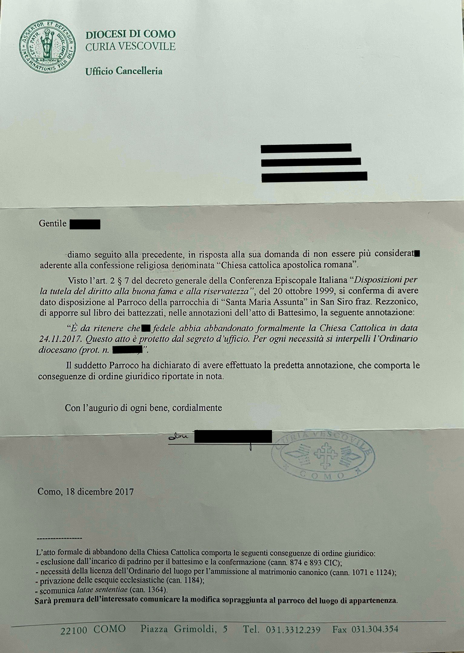 Una persona ha chiesto la rettifica dei dati relativi al proprio battesimo avvenuto a S. Maria Assunta - SAN SIRO (CO) il 18/12/2017, dichiarando di non voler più far parte della Chiesa Cattolica.