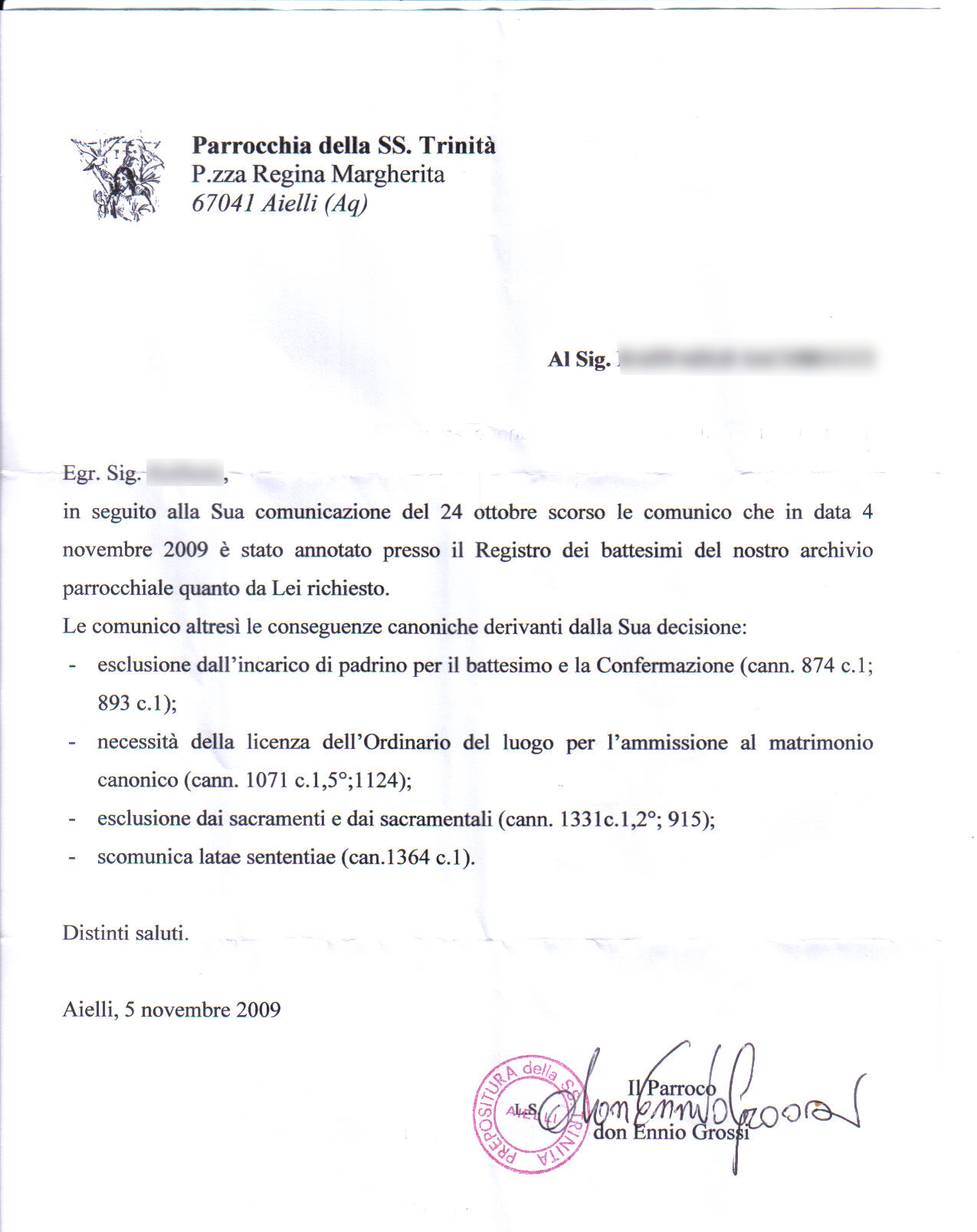 Una persona ha chiesto la rettifica dei dati relativi al proprio battesimo avvenuto a Ss. Trinità - AIELLI (AQ) il 05/11/2009, dichiarando di non voler più far parte della Chiesa Cattolica.