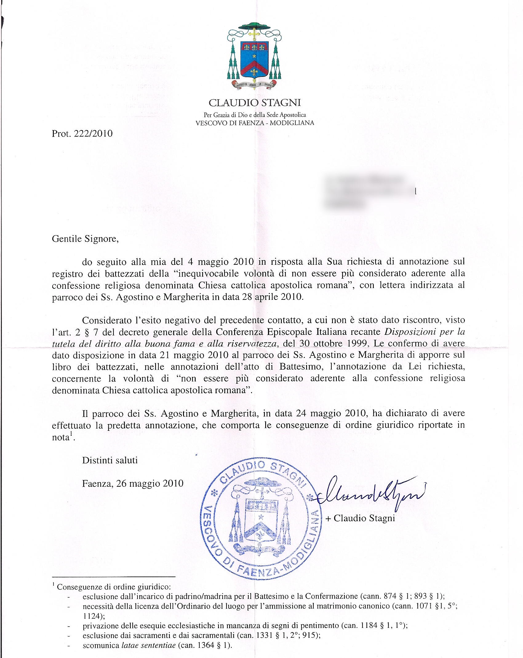 Una persona ha chiesto la rettifica dei dati relativi al proprio battesimo avvenuto a Santi Agostino e Margherita - FAENZA (RA) il 26/05/2010, dichiarando di non voler più far parte della Chiesa Cattolica.