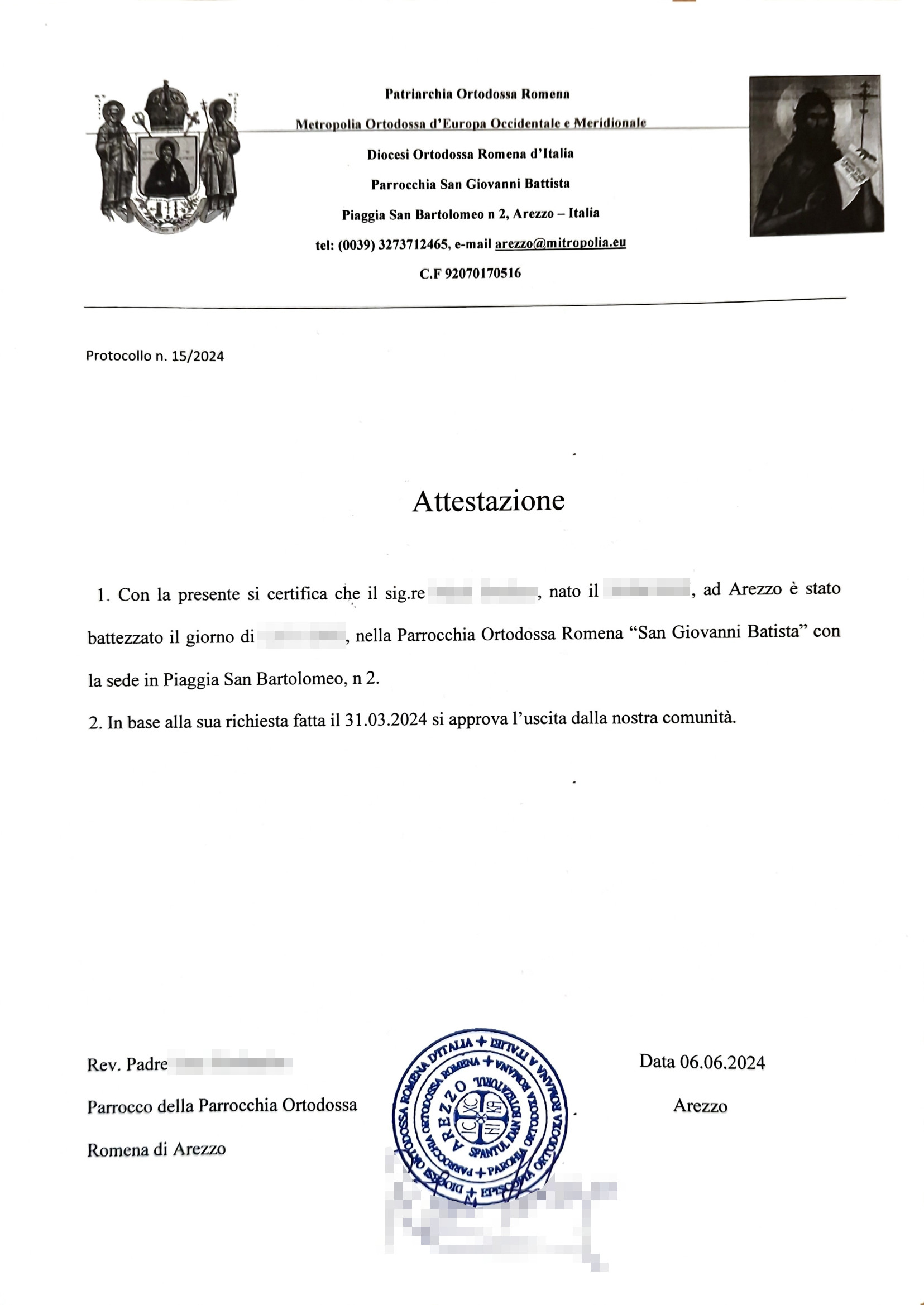 Per rivendicare il mio diritto a non essere più considerato parte della chiesa, siccome tutti i sacramenti mi sono stati impartiti insieme, seguendo il rito ortodosso.