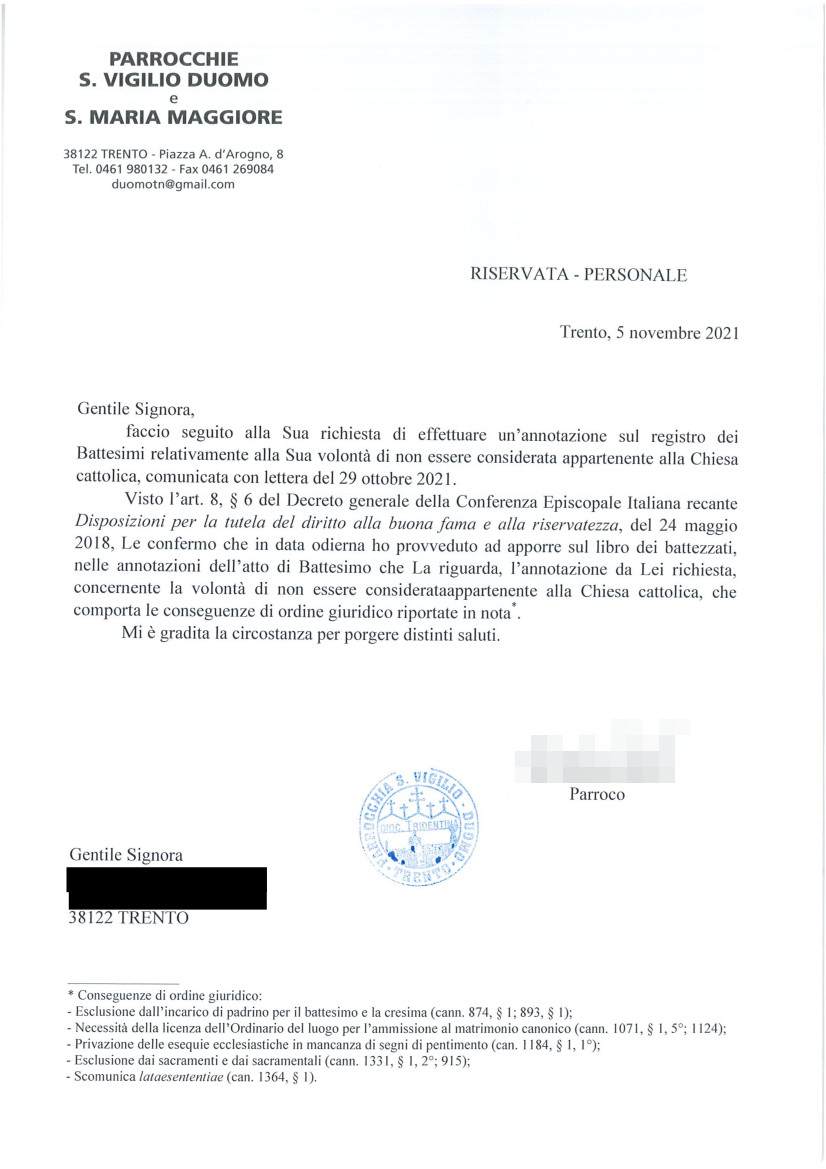 Una persona ha chiesto la rettifica dei dati relativi al proprio battesimo avvenuto a S. Vigilio - TRENTO (TN) il 05/11/2021, dichiarando di non voler più far parte della Chiesa Cattolica.