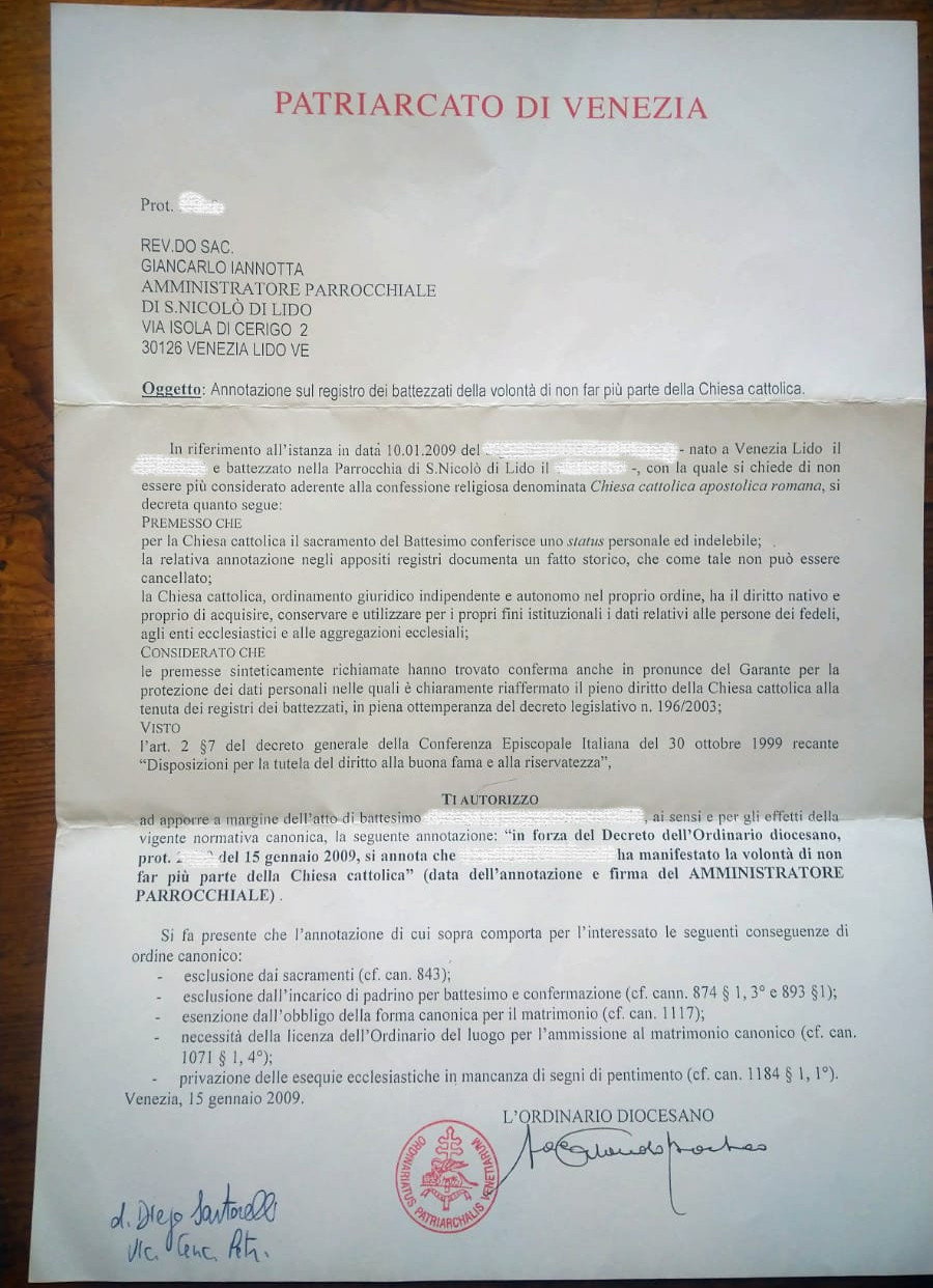 Una persona ha chiesto la rettifica dei dati relativi al proprio battesimo avvenuto a S. Nicola Vescovo di Mira (Vulgo S. Nicolò del Lido) - VENEZIA (VE) il 15/01/2009, dichiarando di non voler più far parte della Chiesa Cattolica.