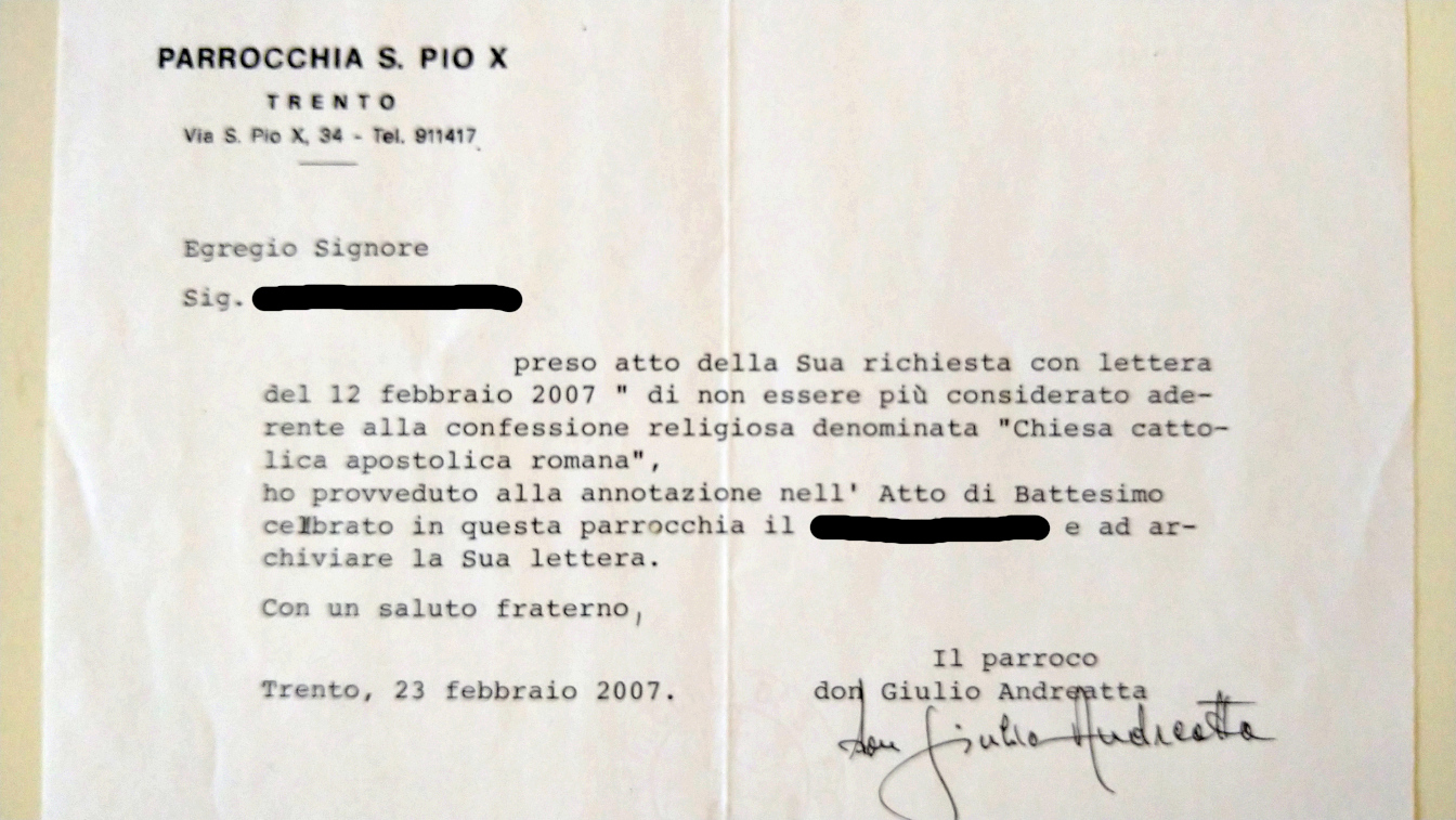 Una persona ha chiesto la rettifica dei dati relativi al proprio battesimo avvenuto a San Pio X - TRENTO (TN) il 23/02/2007, dichiarando di non voler più far parte della Chiesa Cattolica.