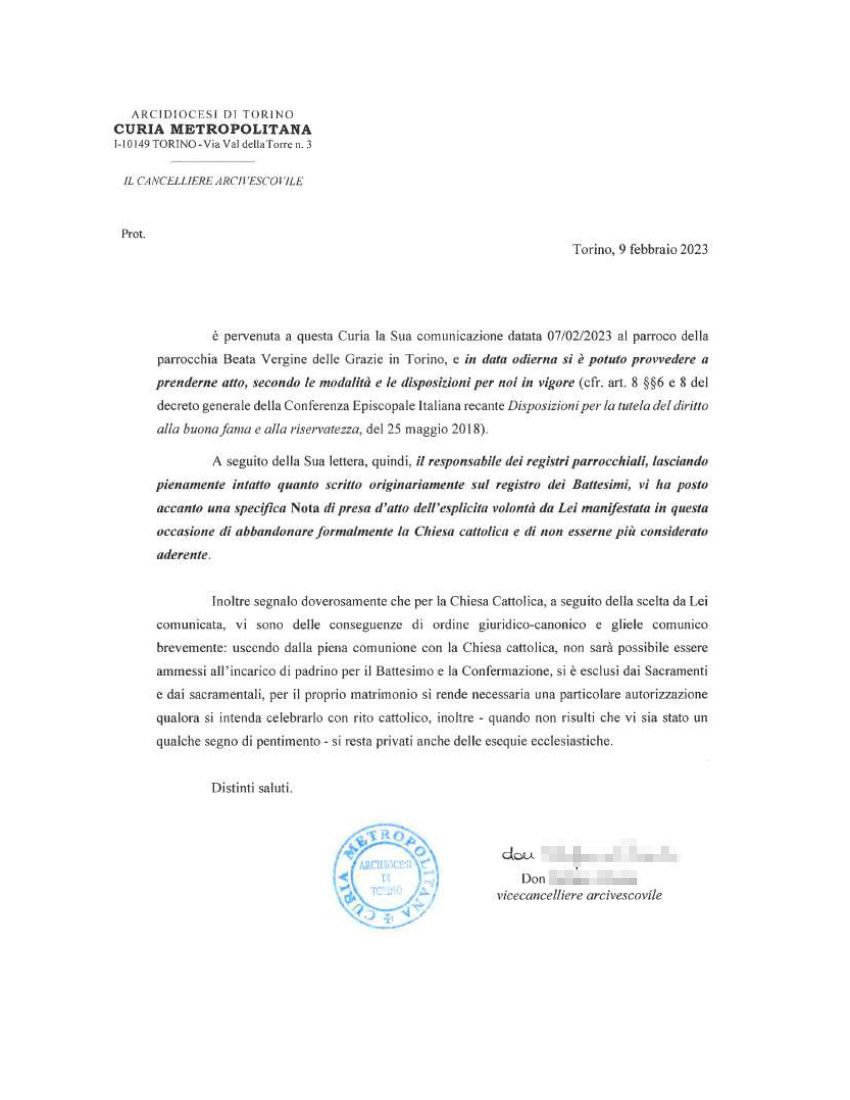 Una persona ha chiesto la rettifica dei dati relativi al proprio battesimo avvenuto a Beata Vergine delle Grazie - TORINO (TO) il 09/02/2023, dichiarando di non voler più far parte della Chiesa Cattolica.