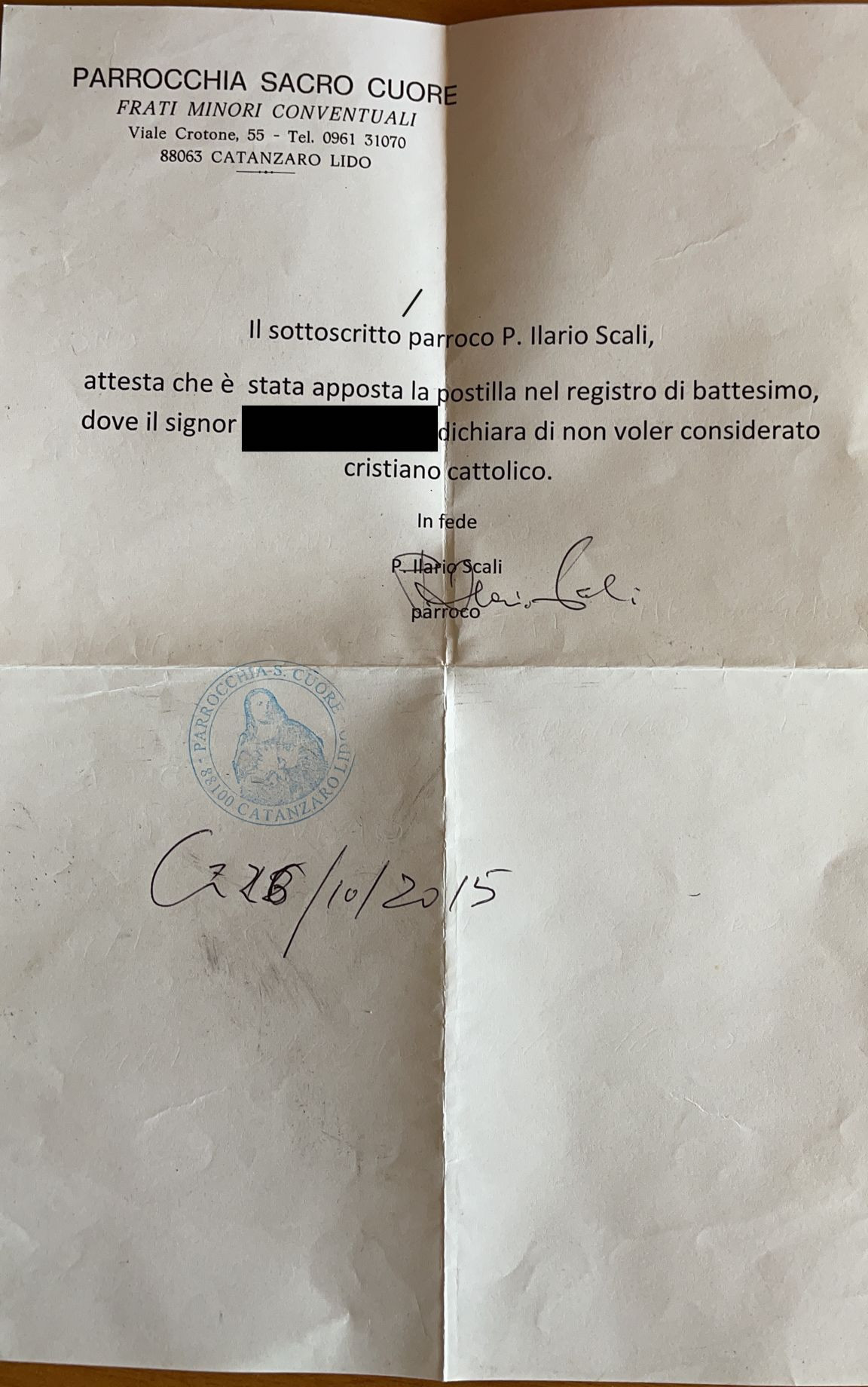 Una persona ha chiesto la rettifica dei dati relativi al proprio battesimo avvenuto a Sacro Cuore - CATANZARO (CZ) il 26/10/2015, dichiarando di non voler più far parte della Chiesa Cattolica.