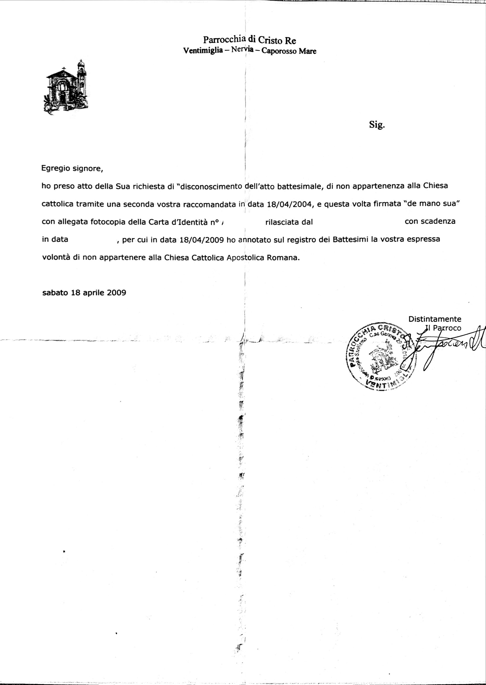 Una persona ha chiesto la rettifica dei dati relativi al proprio battesimo avvenuto a Cristo Re - VENTIMIGLIA (IM) il 18/04/2009, dichiarando di non voler più far parte della Chiesa Cattolica.
