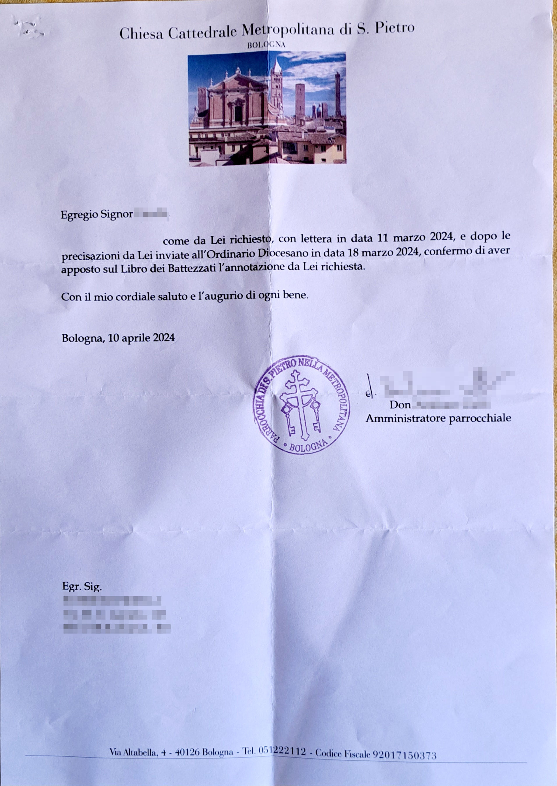 Una persona ha chiesto la rettifica dei dati relativi al proprio battesimo avvenuto a S. Pietro nella Metropolitana - BOLOGNA (BO) il 10/04/2024, dichiarando di non voler più far parte della Chiesa Cattolica.
