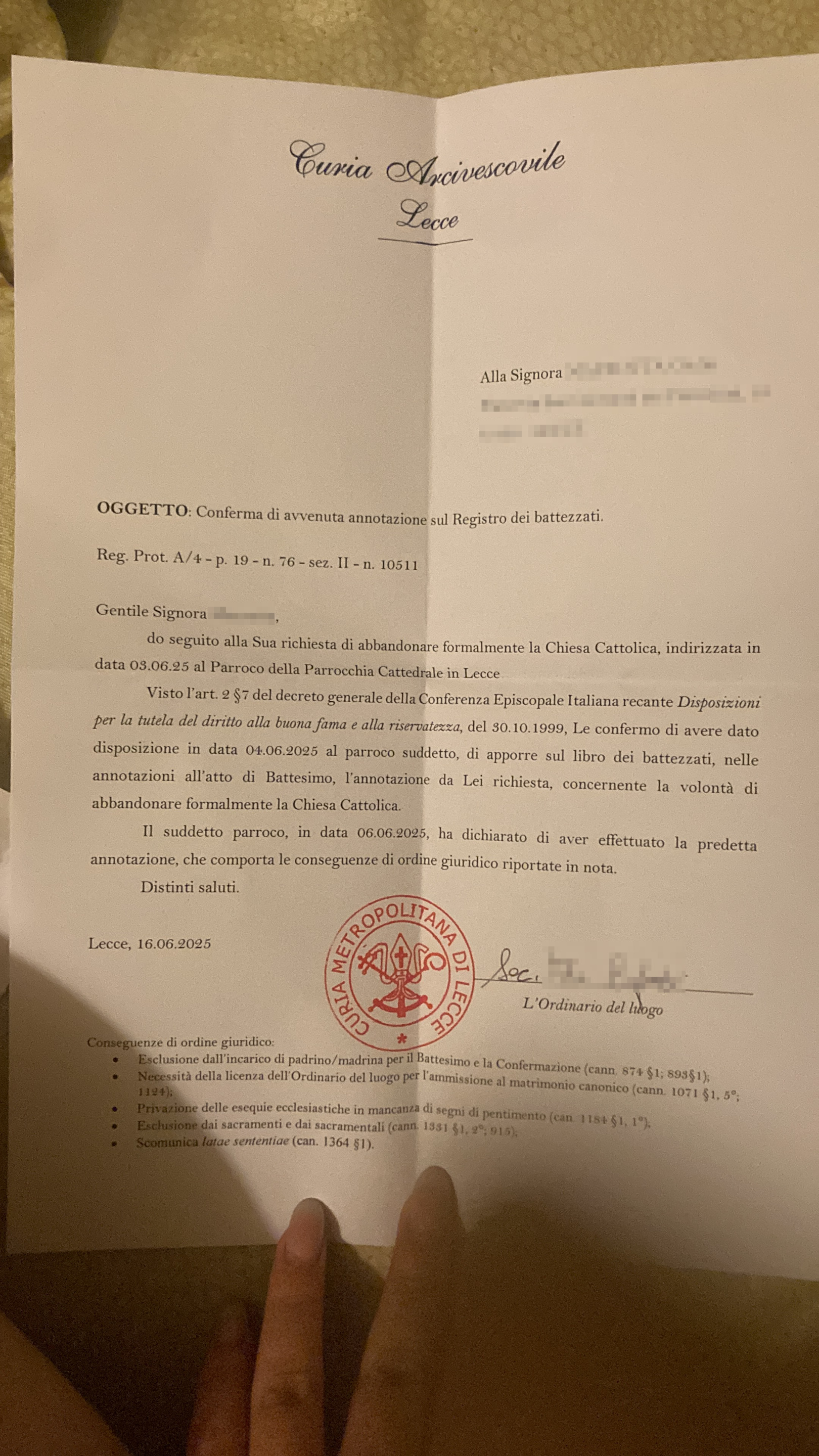 Una persona ha chiesto la rettifica dei dati relativi al proprio battesimo avvenuto a Maria Ss. Assunta - LECCE (LE) il 23/06/2025, dichiarando di non voler più far parte della Chiesa Cattolica.