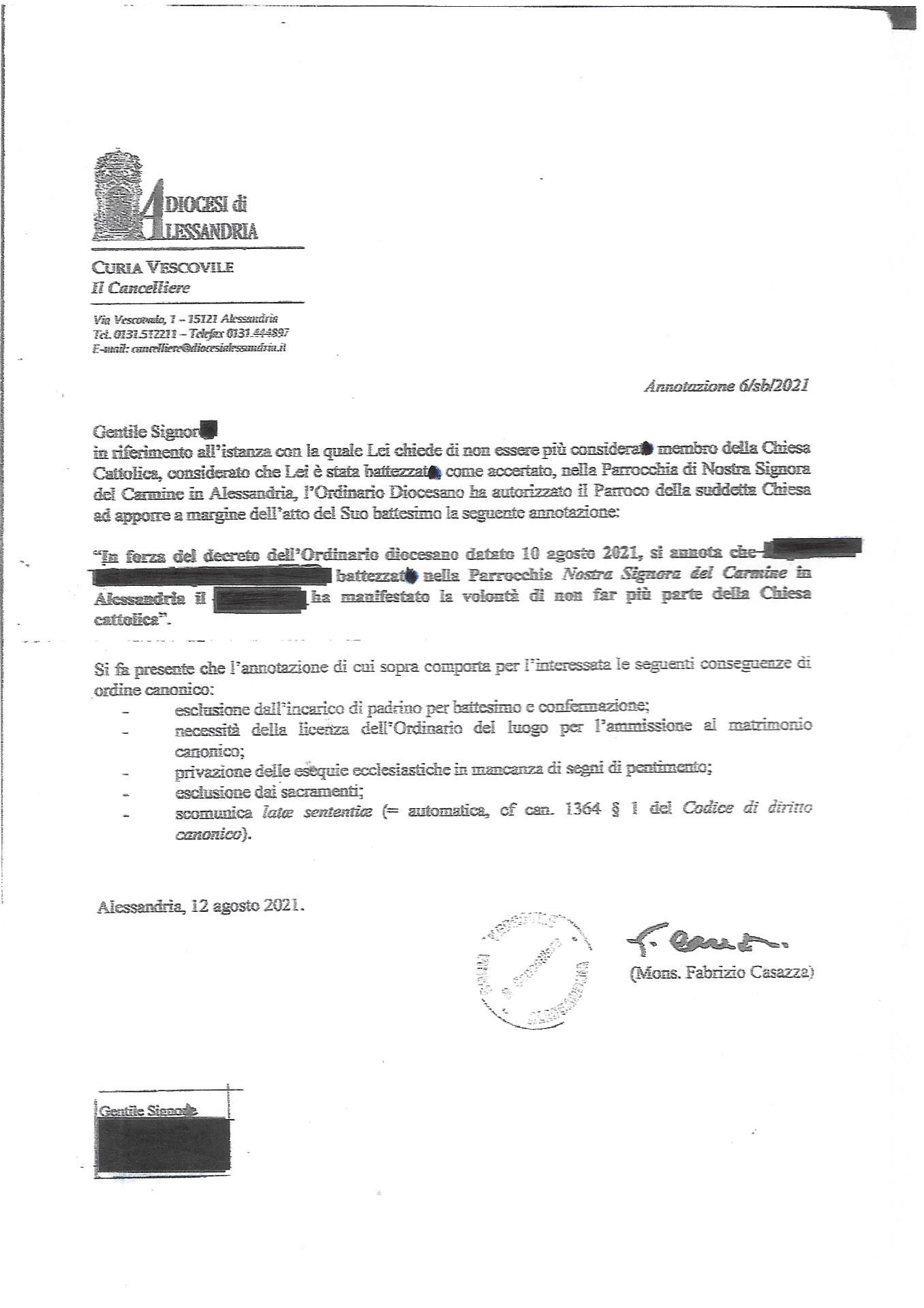 Una persona ha chiesto la rettifica dei dati relativi al proprio battesimo avvenuto a Nostra Signora del Carmine - ALESSANDRIA (AL) il 06/09/2021, dichiarando di non voler più far parte della Chiesa Cattolica.