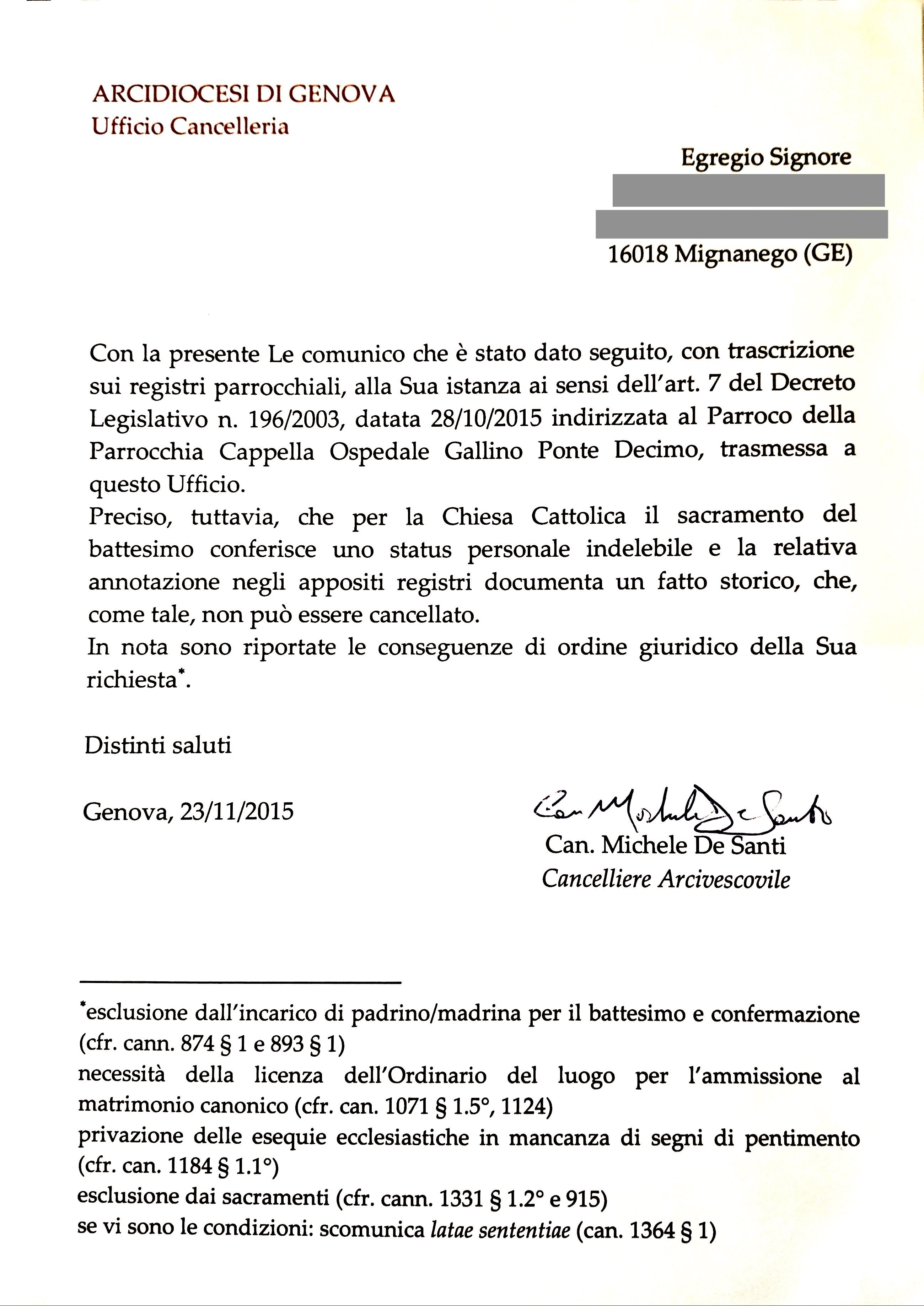 Una persona ha chiesto la rettifica dei dati relativi al proprio battesimo avvenuto a Ospedale Gallino - GENOVA (GE) il 26/11/2015, dichiarando di non voler più far parte della Chiesa Cattolica.