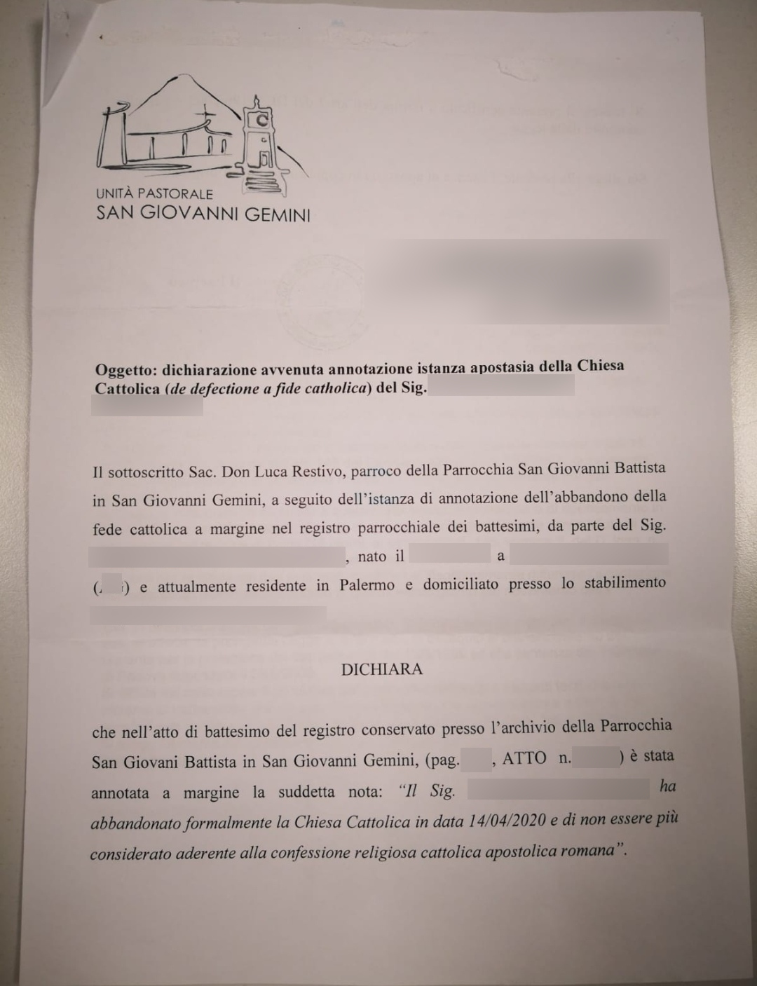 Una persona ha chiesto la rettifica dei dati relativi al proprio battesimo avvenuto a S. Giovanni Battista - SAN GIOVANNI GEMINI (AG) il 06/05/2020, dichiarando di non voler più far parte della Chiesa Cattolica.