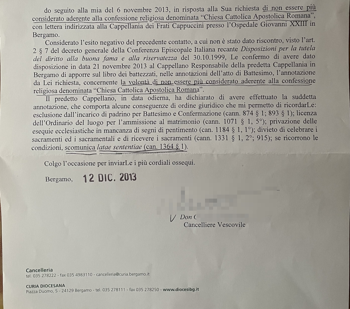 Una persona ha chiesto la rettifica dei dati relativi al proprio battesimo avvenuto a S. Caterina Vergine e Martire - BERGAMO (BG) il 22/12/2013, dichiarando di non voler più far parte della Chiesa Cattolica.