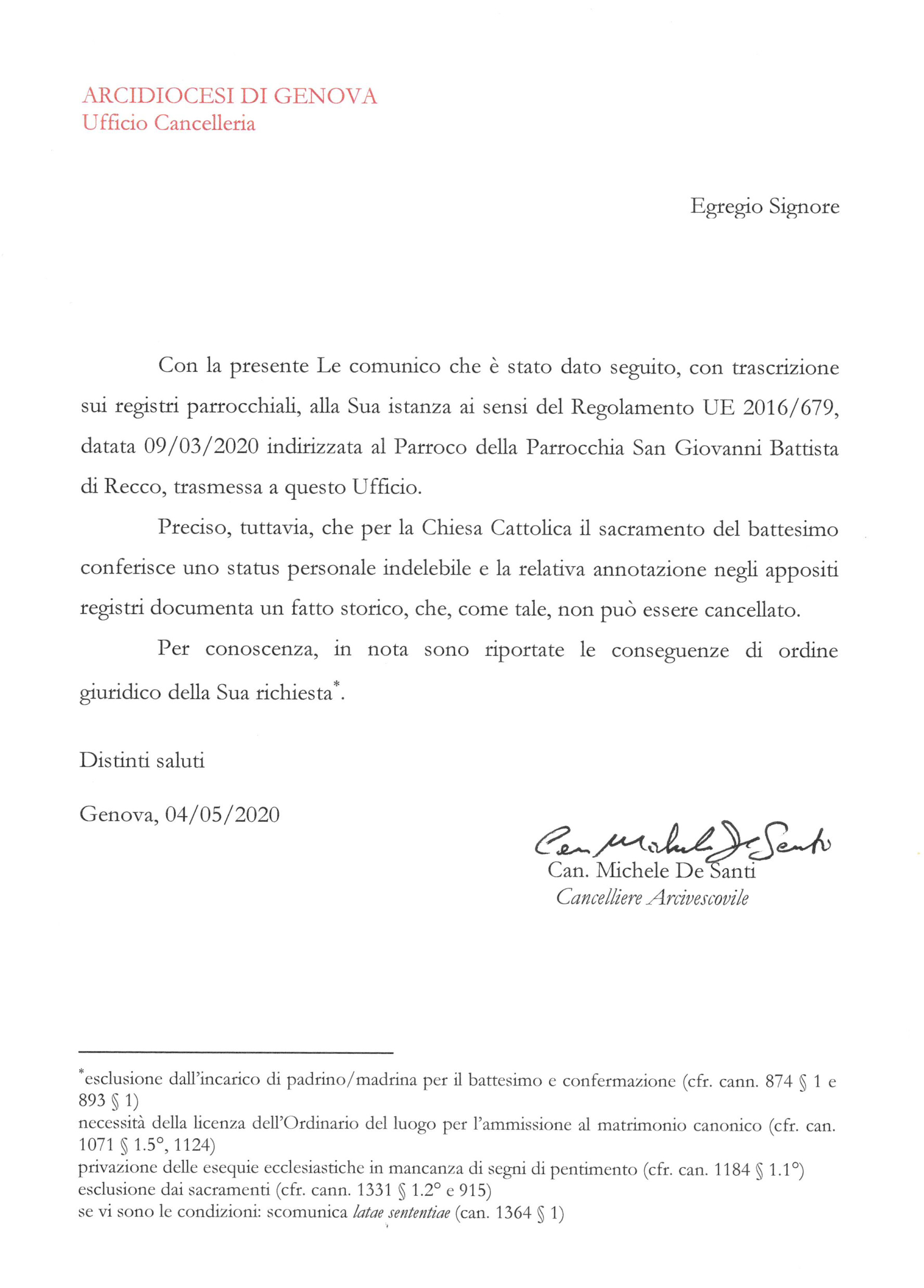 Una persona ha chiesto la rettifica dei dati relativi al proprio battesimo avvenuto a S. Giovanni Battista - RECCO (GE) il 04/05/2020, dichiarando di non voler più far parte della Chiesa Cattolica.