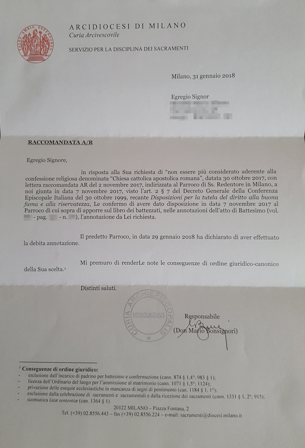 Una persona ha chiesto la rettifica dei dati relativi al proprio battesimo avvenuto a Ss. Redentore - MILANO (MI) il 29/01/2018, dichiarando di non voler più far parte della Chiesa Cattolica.