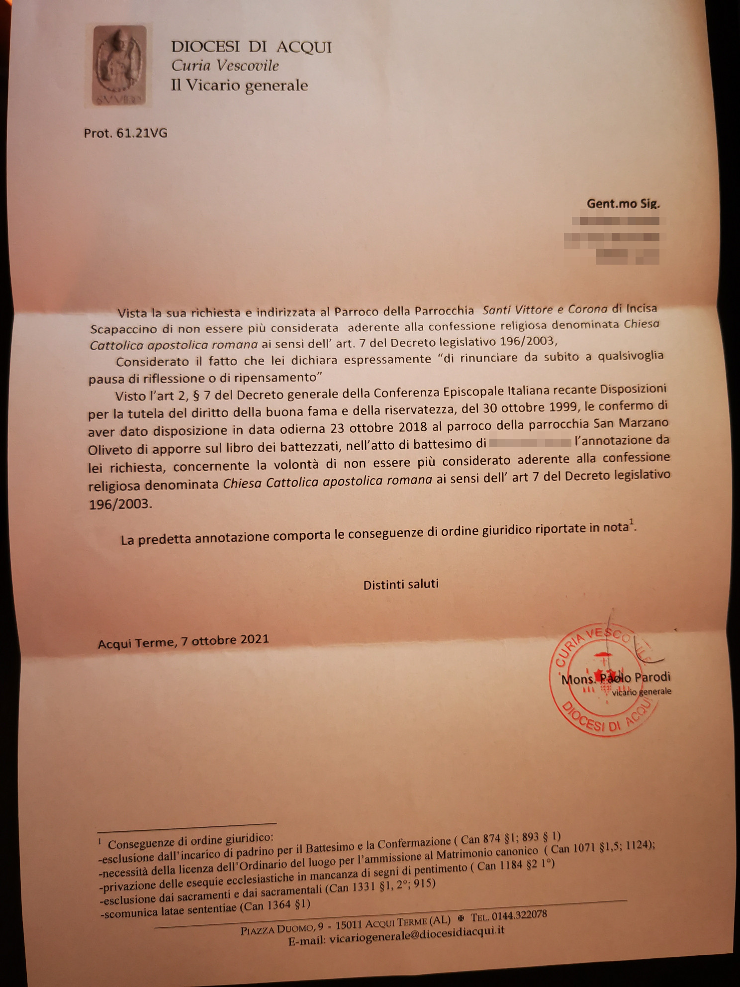 Un piccolo passo verso un futuro libero da pregiudizi religiosi, da restrizioni idiologiche e poteri teocratici patriarcali. Sono cosciente che la "cultura" cattolica è, e sarà sempre, parte della persona che sono anche dopo decenni di astensione ai riti. L'indottrinamento va in profondità! Sarò sempre grato dei momenti di gioia che ho passato con i miei amici giocando all'Oratorio, ma la libertà individuale di scelta va oltre a tutti i vincoli e le pressioni che ho, e abbiamo, dovuto subire.