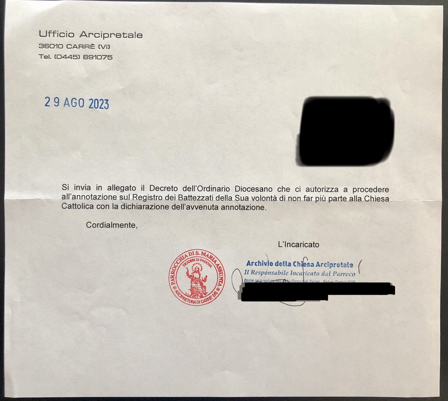 Una persona ha chiesto la rettifica dei dati relativi al proprio battesimo avvenuto a Santa Maria Assunta - CARRÈ (VI) il 29/08/2023, dichiarando di non voler più far parte della Chiesa Cattolica.