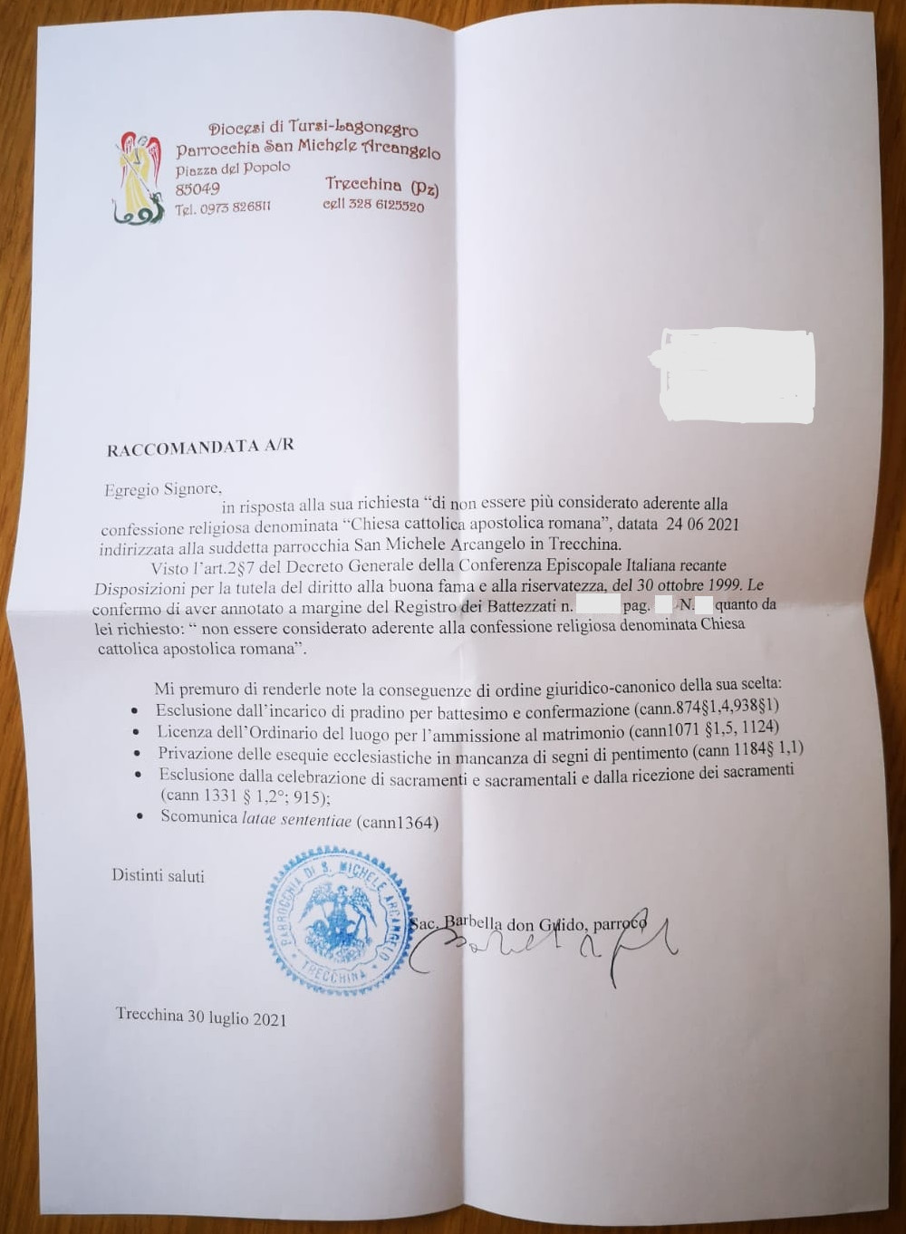 Una persona ha chiesto la rettifica dei dati relativi al proprio battesimo avvenuto a S. Michele Arcangelo - TRECCHINA (PZ) il 30/07/2021, dichiarando di non voler più far parte della Chiesa Cattolica.