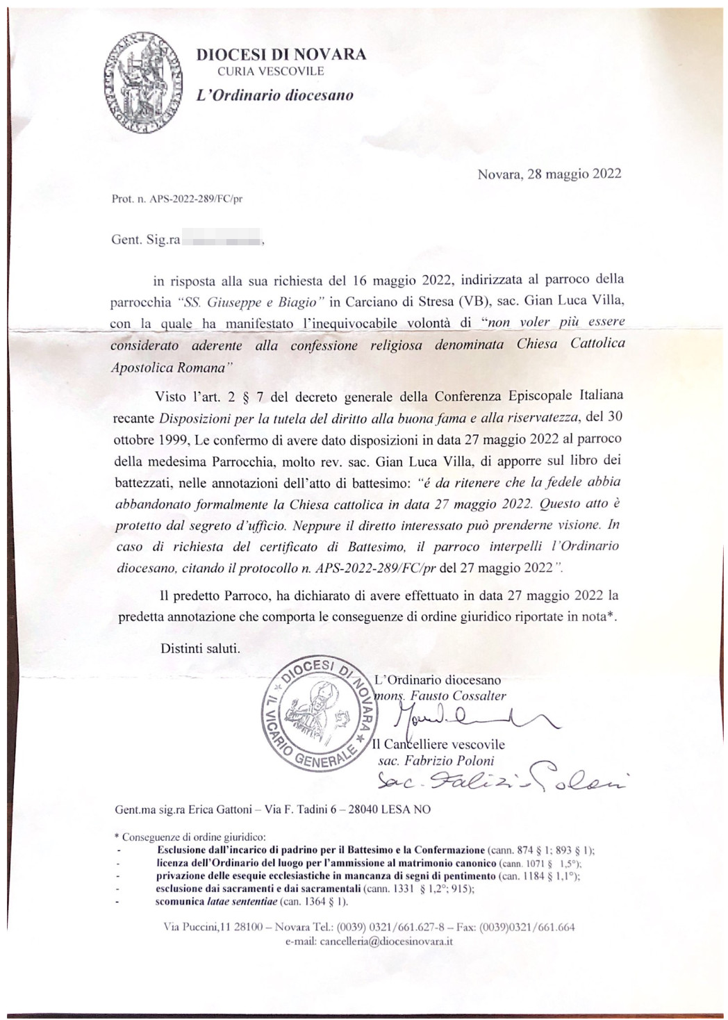 Una persona ha chiesto la rettifica dei dati relativi al proprio battesimo avvenuto a Santi Giuseppe e Biagio - STRESA (VB) il 28/05/2022, dichiarando di non voler più far parte della Chiesa Cattolica.