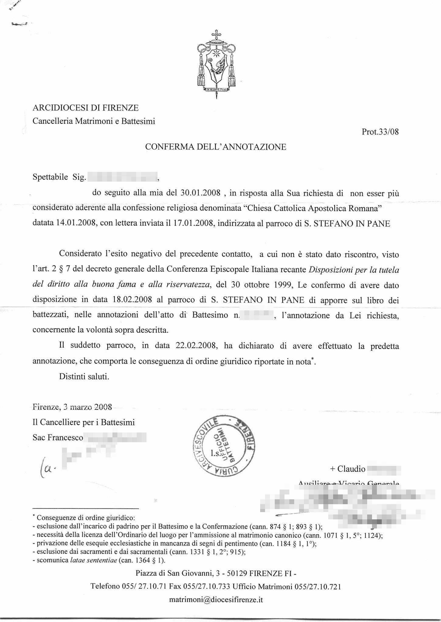 Una persona ha chiesto la rettifica dei dati relativi al proprio battesimo avvenuto a S. Stefano in Pane a Rifredi - FIRENZE (FI) il 03/03/2008, dichiarando di non voler più far parte della Chiesa Cattolica.