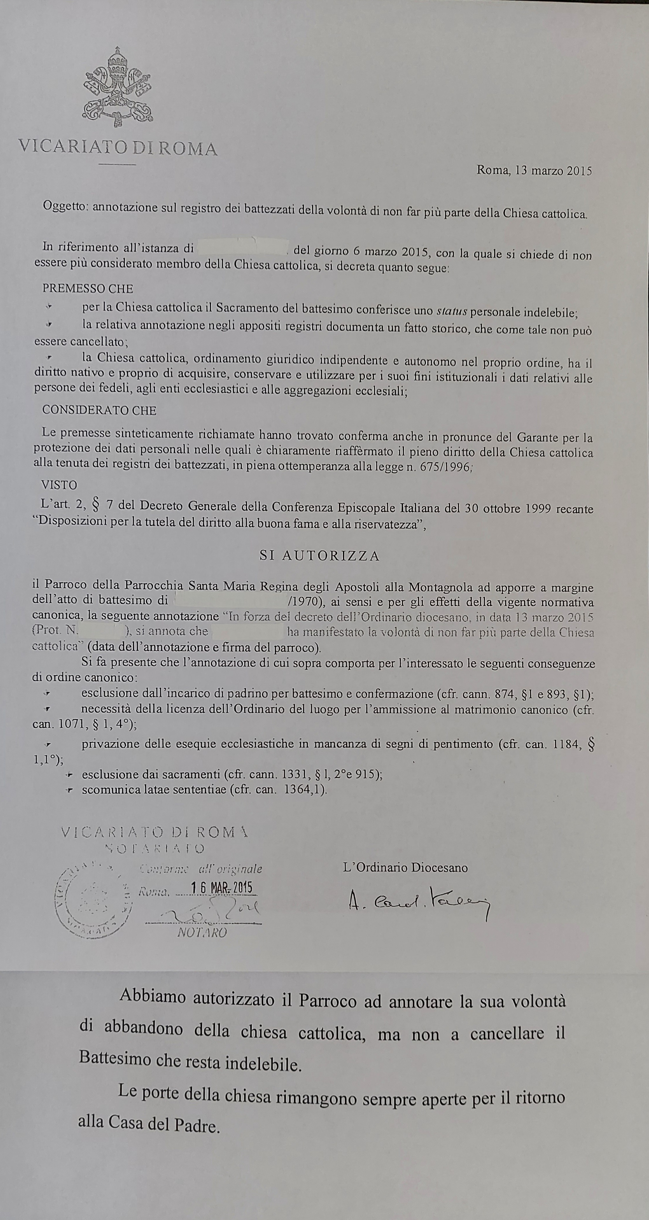 Una persona ha chiesto la rettifica dei dati relativi al proprio battesimo avvenuto a S. Maria Regina Degli Apostoli alla Montagnola - ROMA (RM) il 13/03/2015, dichiarando di non voler più far parte della Chiesa Cattolica.