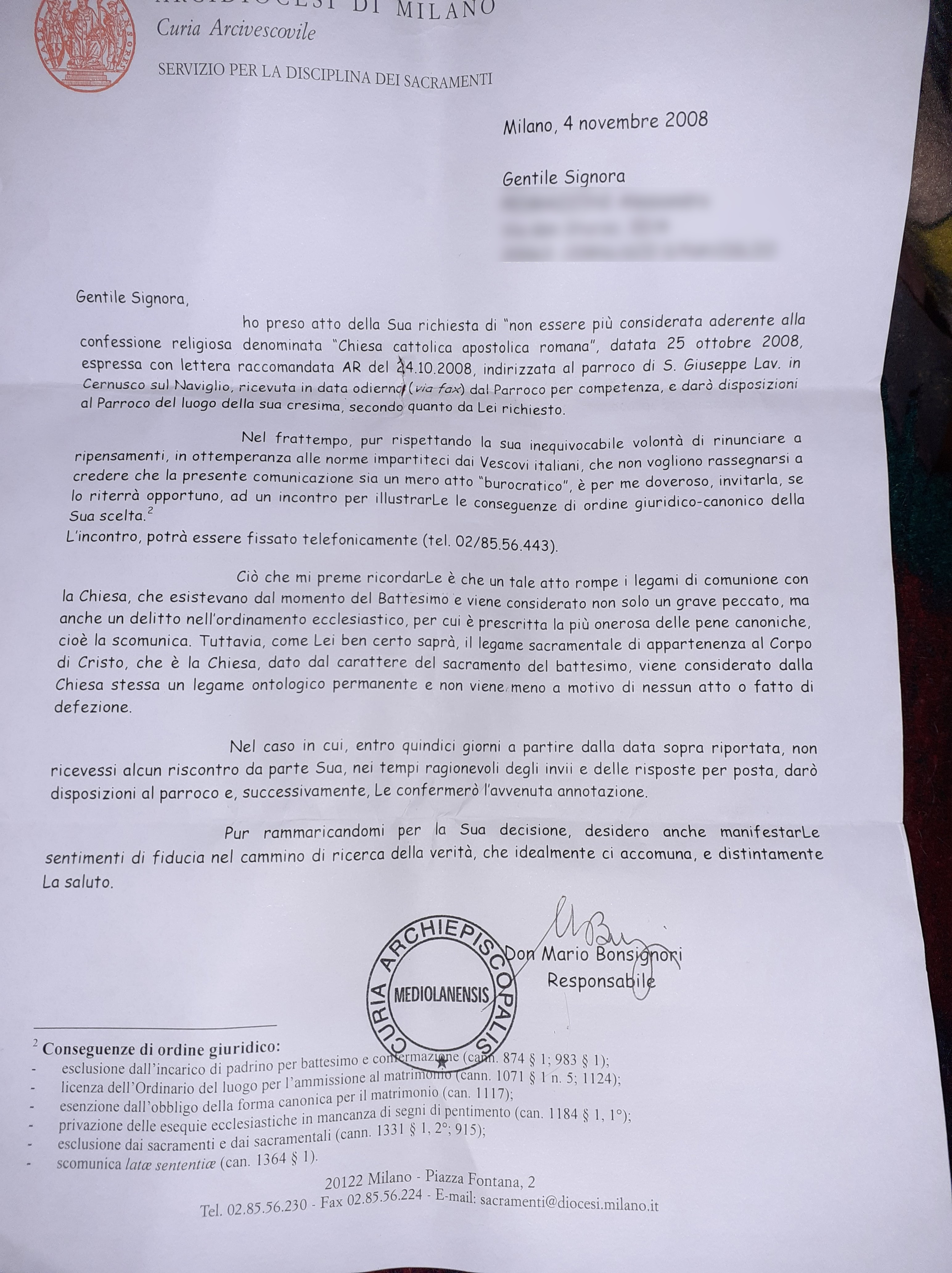 Una persona ha chiesto la rettifica dei dati relativi al proprio battesimo avvenuto a S. Giuseppe Lavoratore - CERNUSCO SUL NAVIGLIO (MI) il 04/11/2008, dichiarando di non voler più far parte della Chiesa Cattolica.