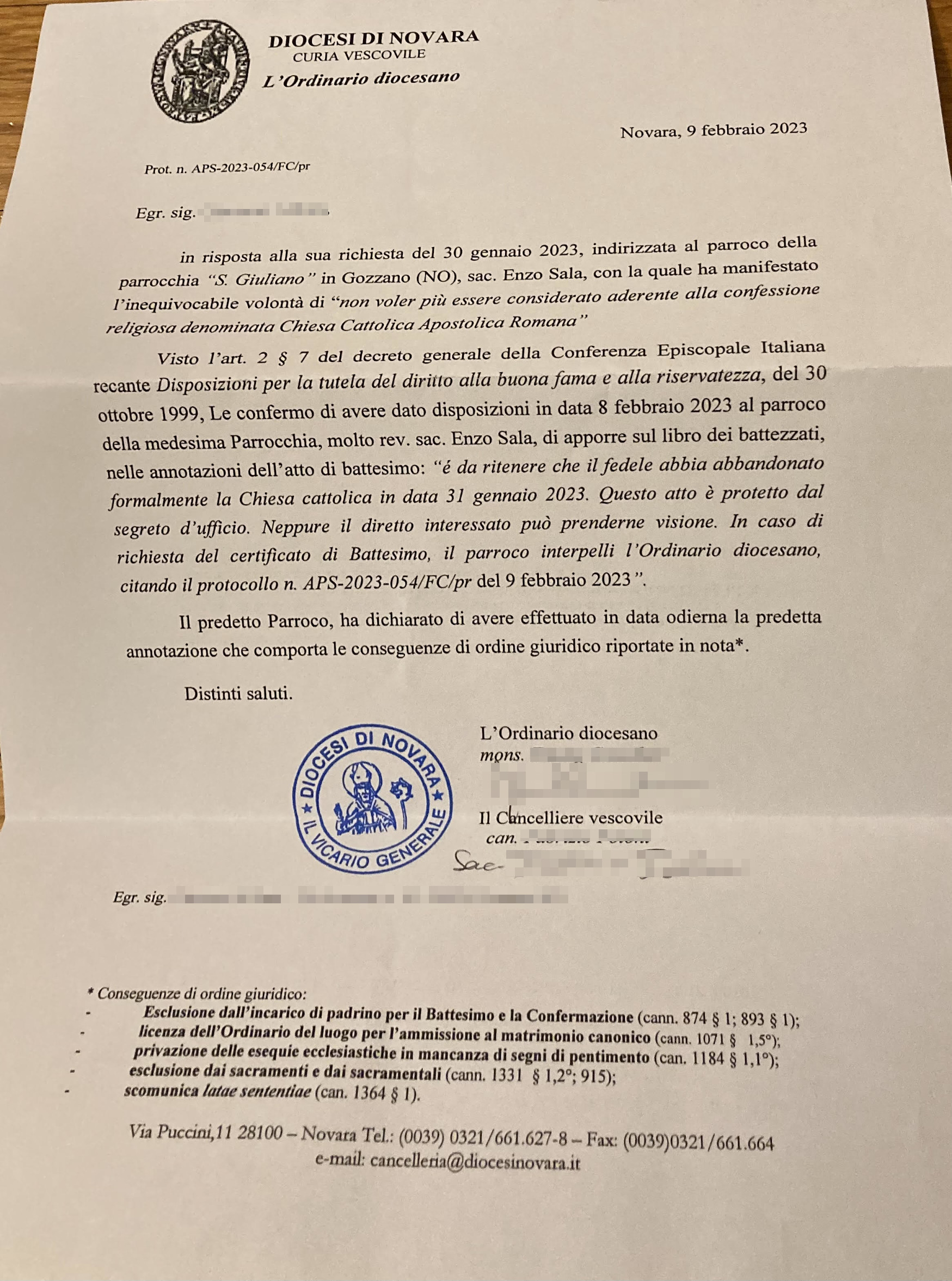 Una persona ha chiesto la rettifica dei dati relativi al proprio battesimo avvenuto a S. Giuliano - GOZZANO (NO) il 16/02/2023, dichiarando di non voler più far parte della Chiesa Cattolica.