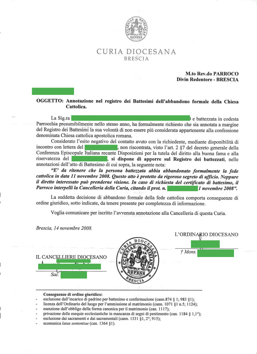 Una persona ha chiesto la rettifica dei dati relativi al proprio battesimo avvenuto a Divin Redentore - BRESCIA (BS) il 14/11/2018, dichiarando di non voler più far parte della Chiesa Cattolica.