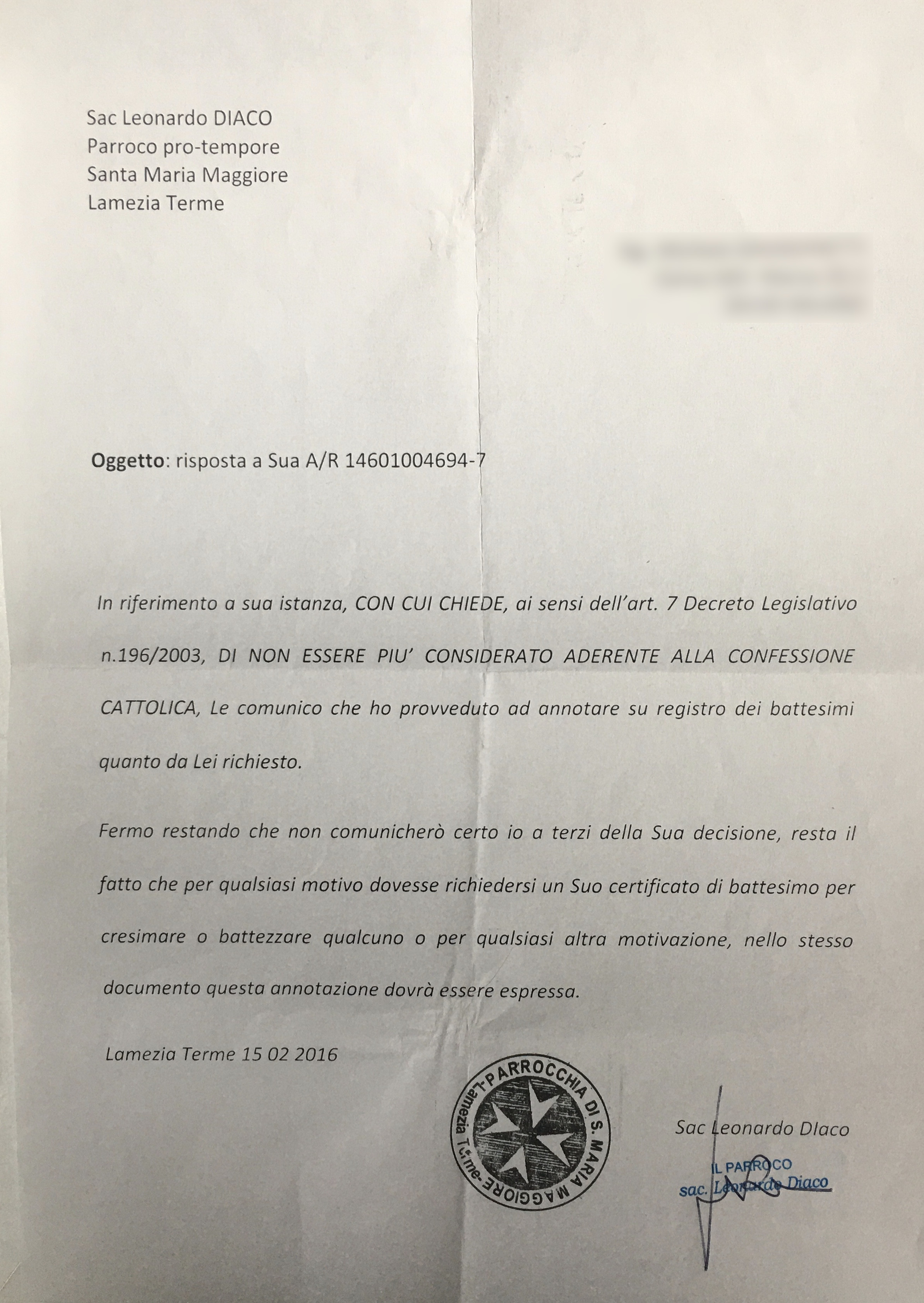 Una persona ha chiesto la rettifica dei dati relativi al proprio battesimo avvenuto a Santa Maria Maggiore - LAMEZIA TERME (CZ) il 15/02/2016, dichiarando di non voler più far parte della Chiesa Cattolica.