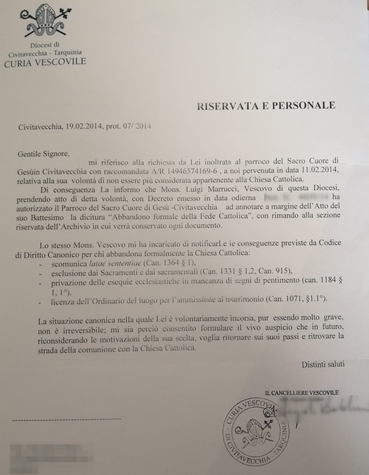 Una persona ha chiesto la rettifica dei dati relativi al proprio battesimo avvenuto a Sacro Cuore - CIVITAVECCHIA (RM) il 02/12/2014, dichiarando di non voler più far parte della Chiesa Cattolica.