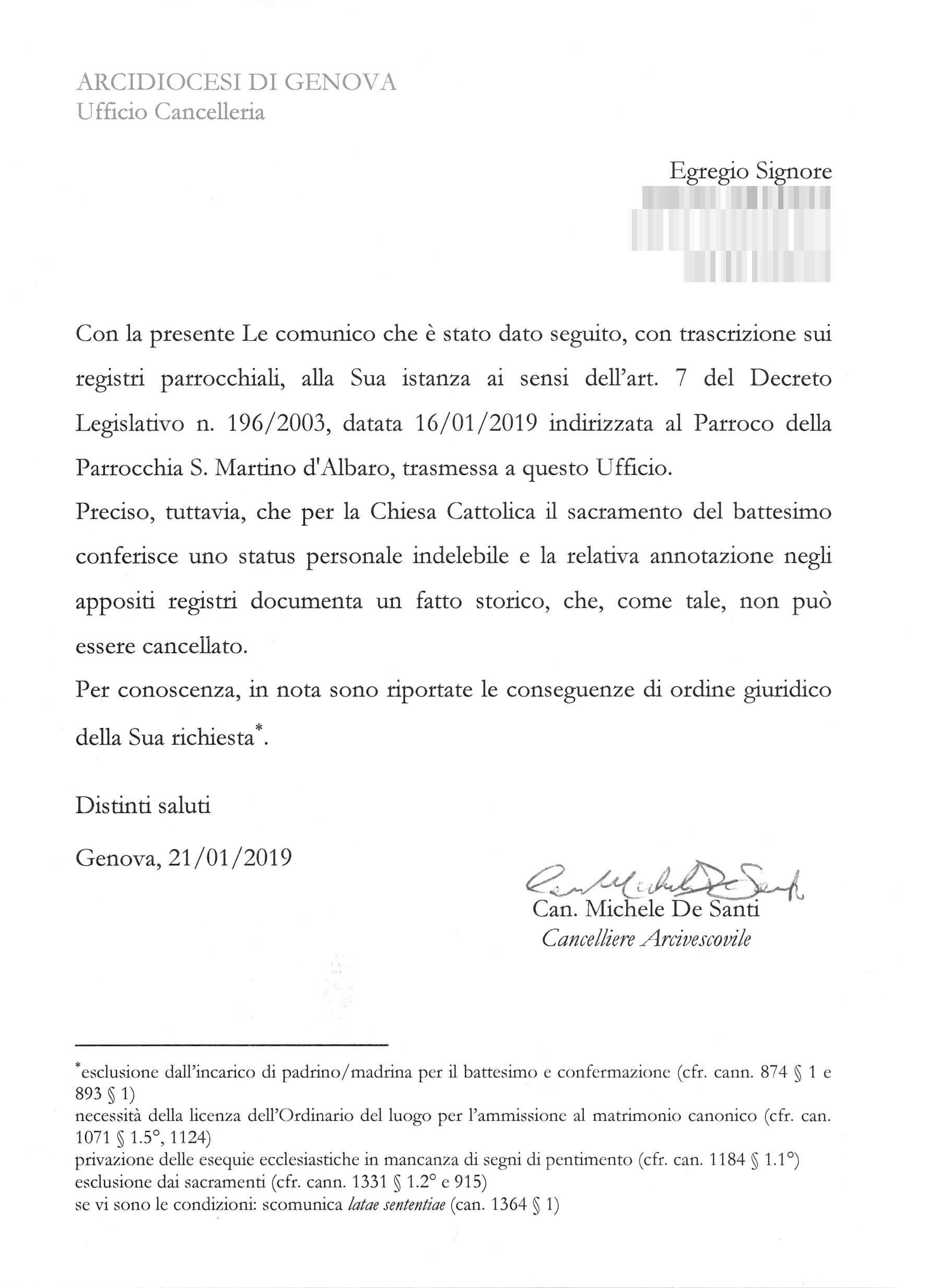 Una persona ha chiesto la rettifica dei dati relativi al proprio battesimo avvenuto a S. Martino d'Albaro - GENOVA (GE) il 21/01/2019, dichiarando di non voler più far parte della Chiesa Cattolica.